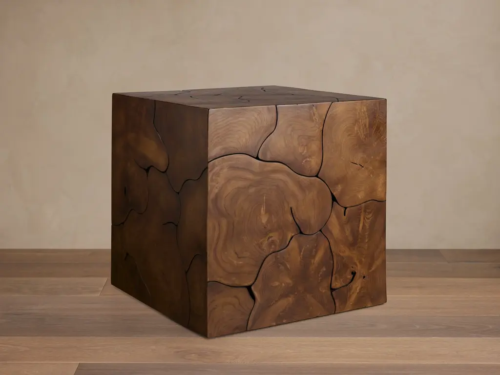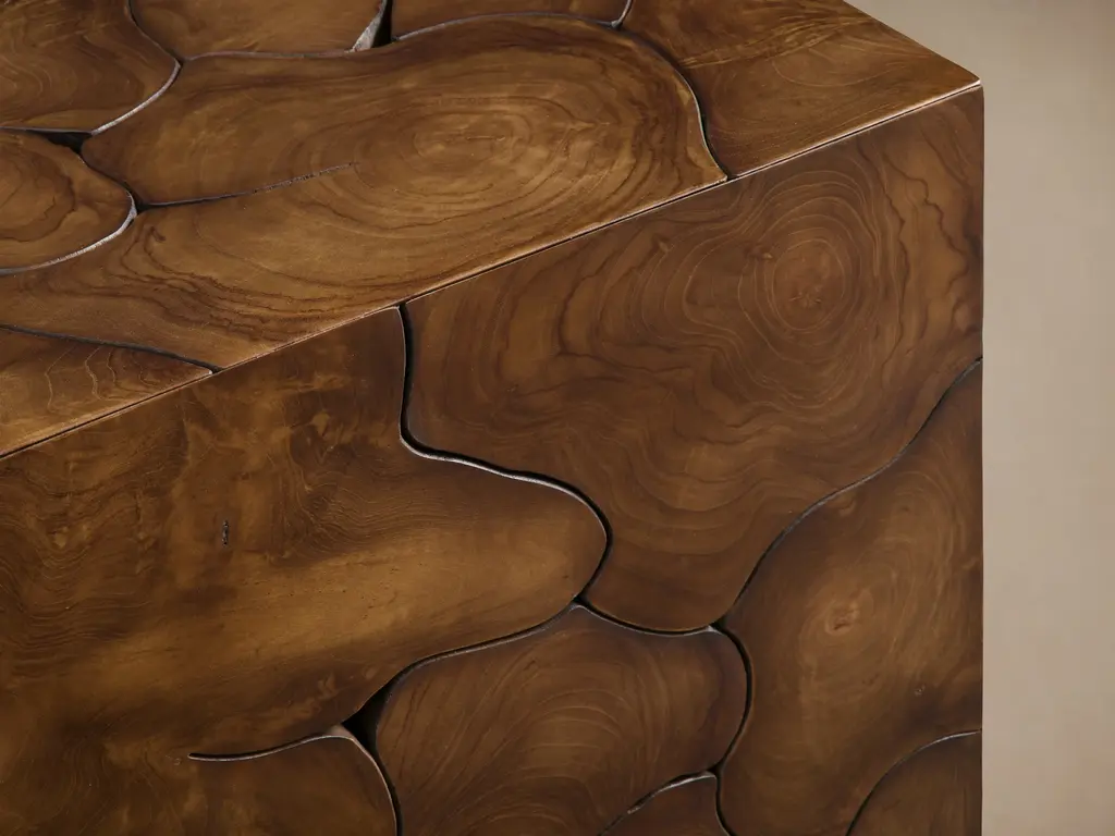 Masterfully handcrafted by our artisan partners in Indonesia, our Kalmar Collection is thoughtfully pieced together from slices of teak heartwood and sapwood affixed to solid wood frames. Each hand-cut section of teak is carefully sanded, smoothed, waxed, and sealed by hand to enhance its natural variations in wood tones, grain patterns, texture, and shape—making it truly one of a kind.