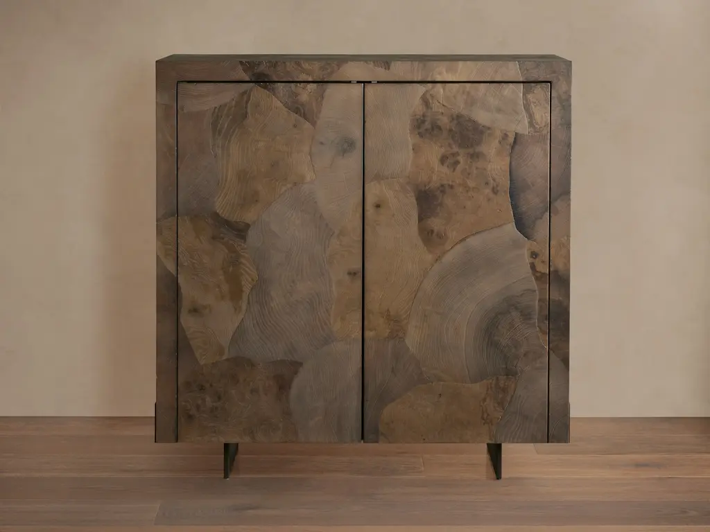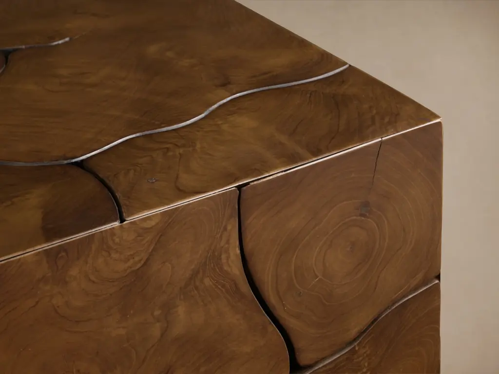 Masterfully handcrafted by our artisan partners in Indonesia, our Kalmar Collection is thoughtfully pieced together from slices of teak heartwood and sapwood affixed to solid wood frames. Each hand-cut section of teak is carefully sanded, smoothed, waxed, and sealed by hand to enhance its natural variations in wood tones, grain patterns, texture, and shape—making it truly one of a kind.