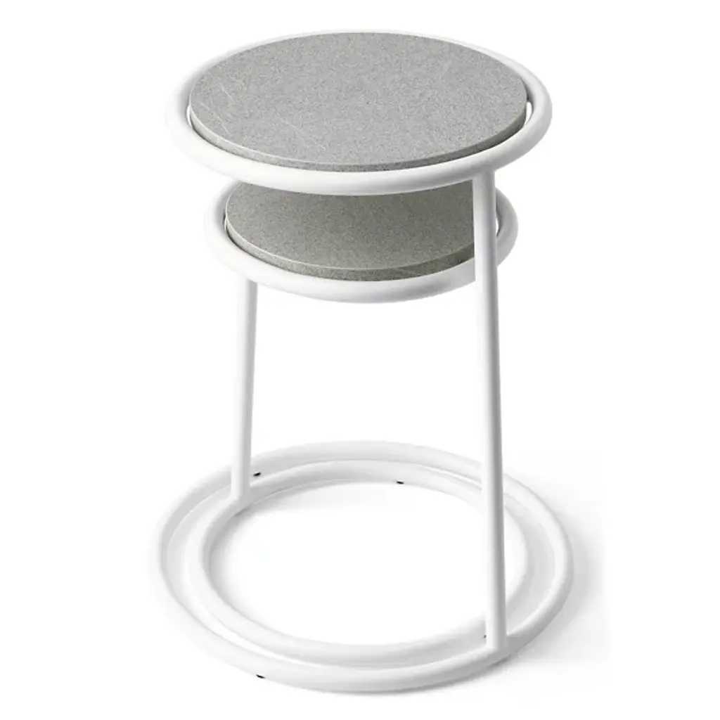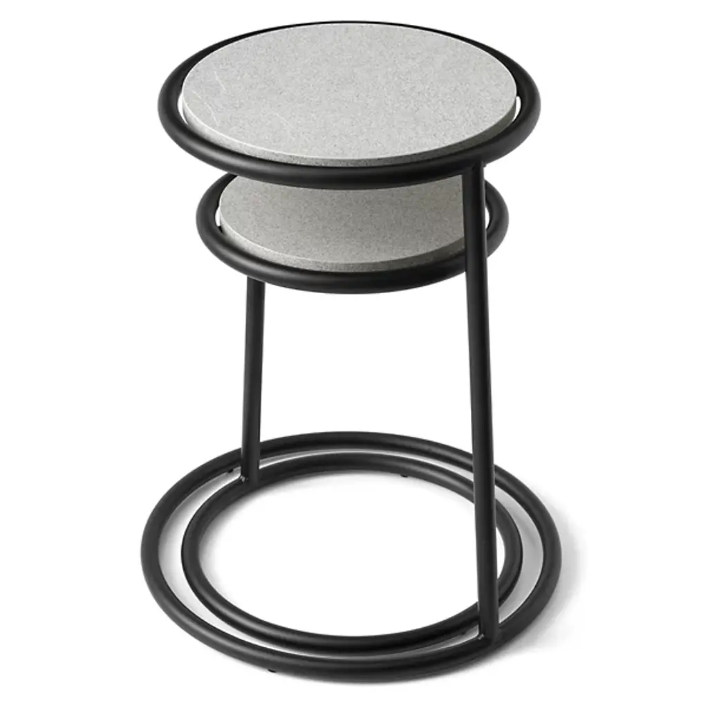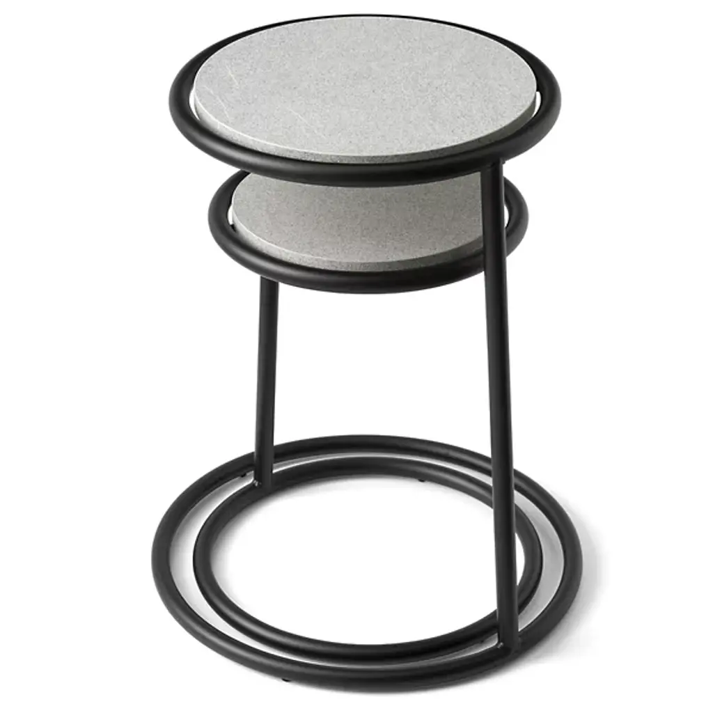 The Kangoo Side Table by Connubia was made in Italy and has a playful charm that draws from mid-century modern design. A tubular frame in lacquered metal creates two halos that mirror the other. The base of the table is a hollow circle, while the rounded top is made of a dappled grey Piasentina Stone Melamine. It’s a contemporary piece of furniture that infuses practicality with a keen sense of style.