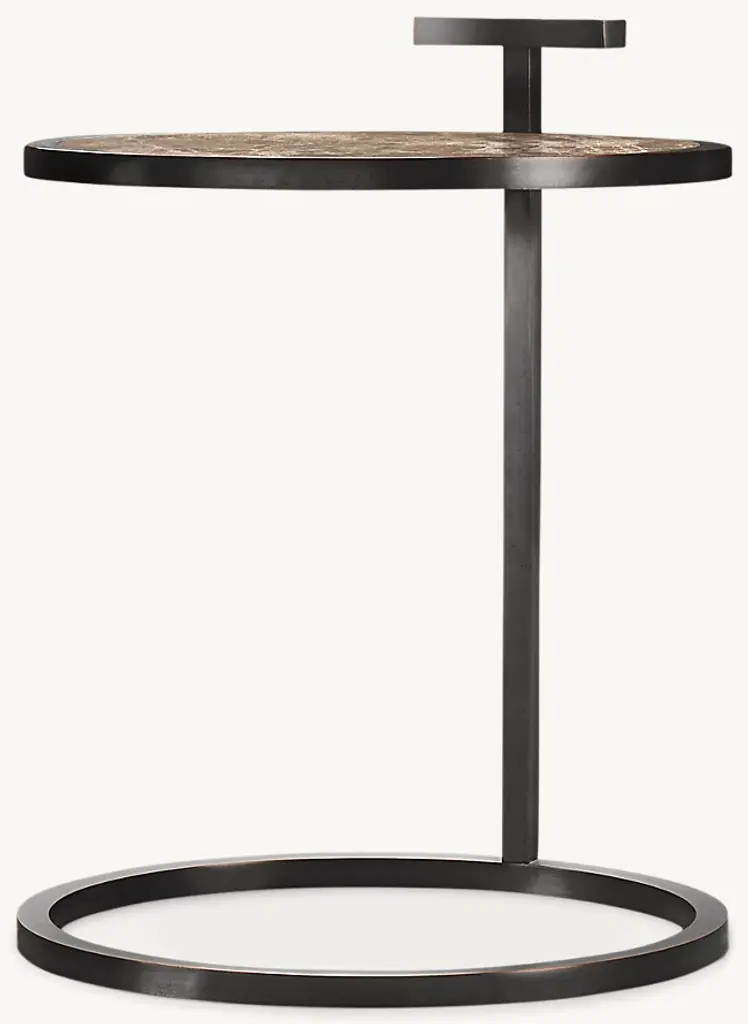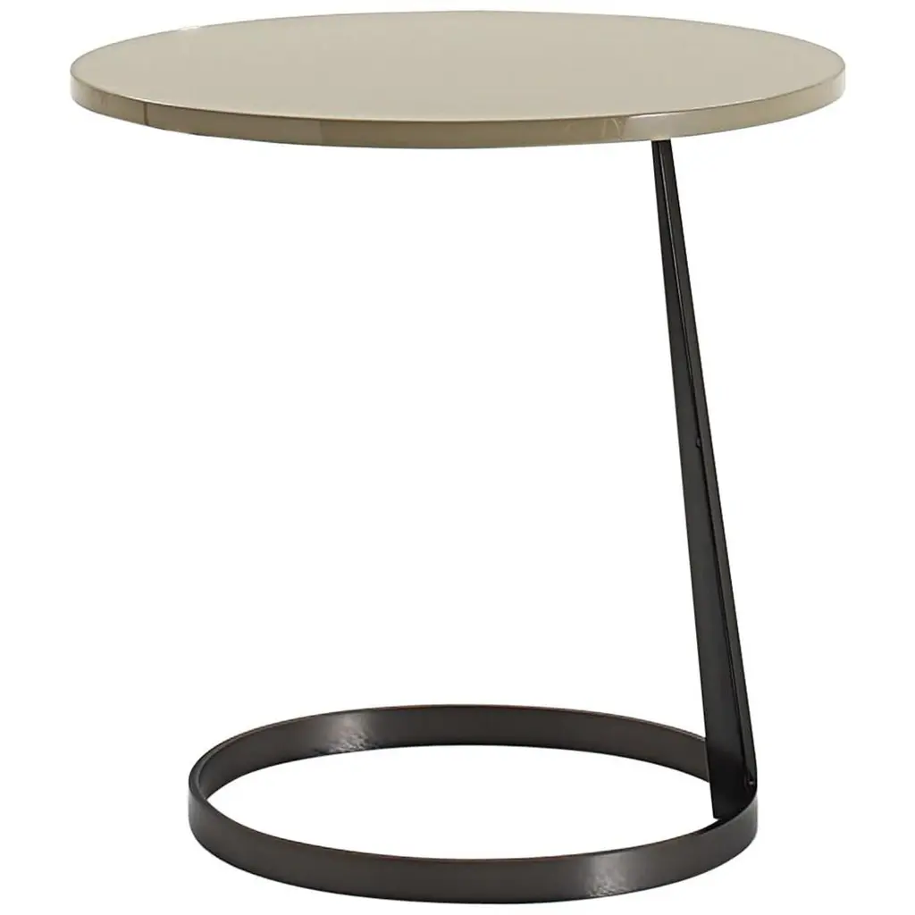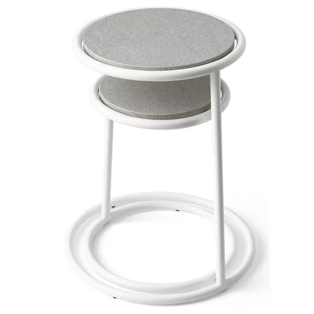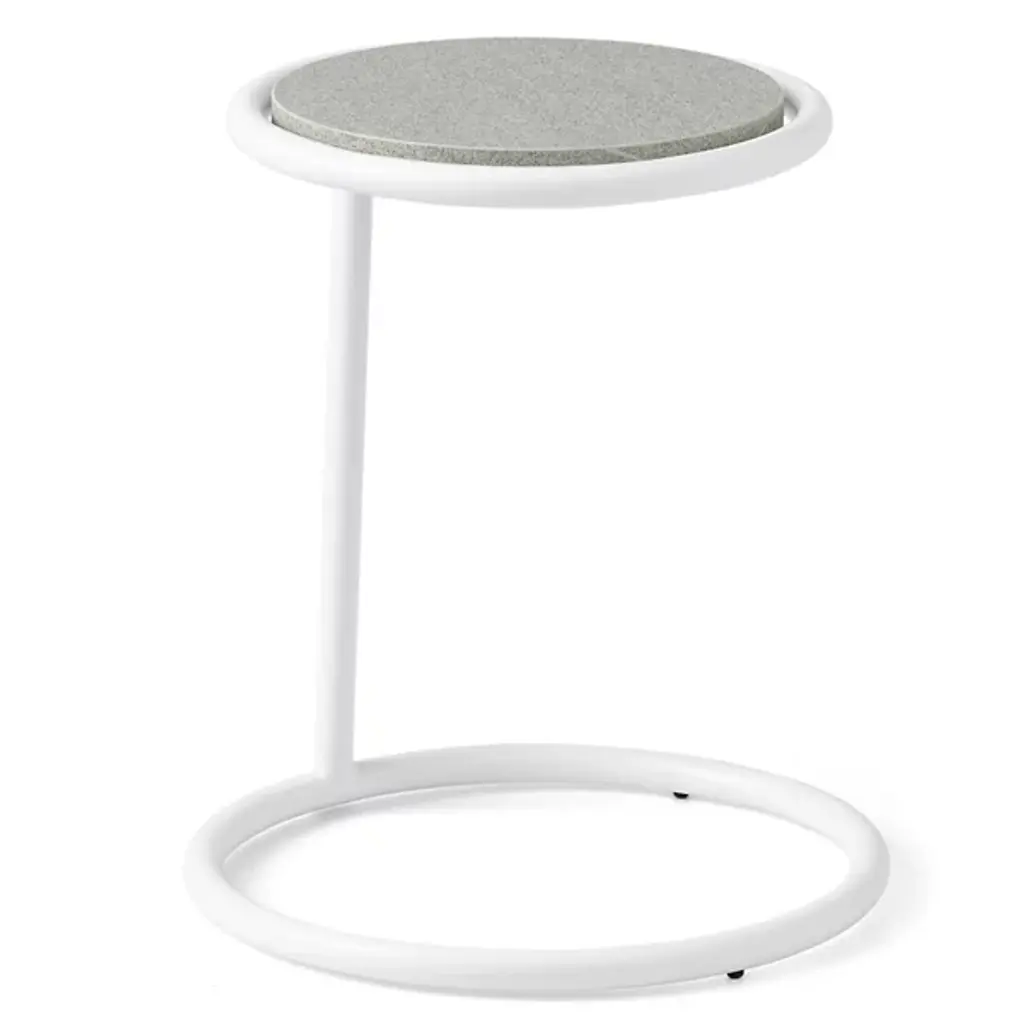 The Kangoo Side Table by Connubia was made in Italy and has a playful charm that draws from mid-century modern design. A tubular frame in lacquered metal creates two halos that mirror the other. The base of the table is a hollow circle, while the rounded top is made of a dappled grey Piasentina Stone Melamine. It’s a contemporary piece of furniture that infuses practicality with a keen sense of style.