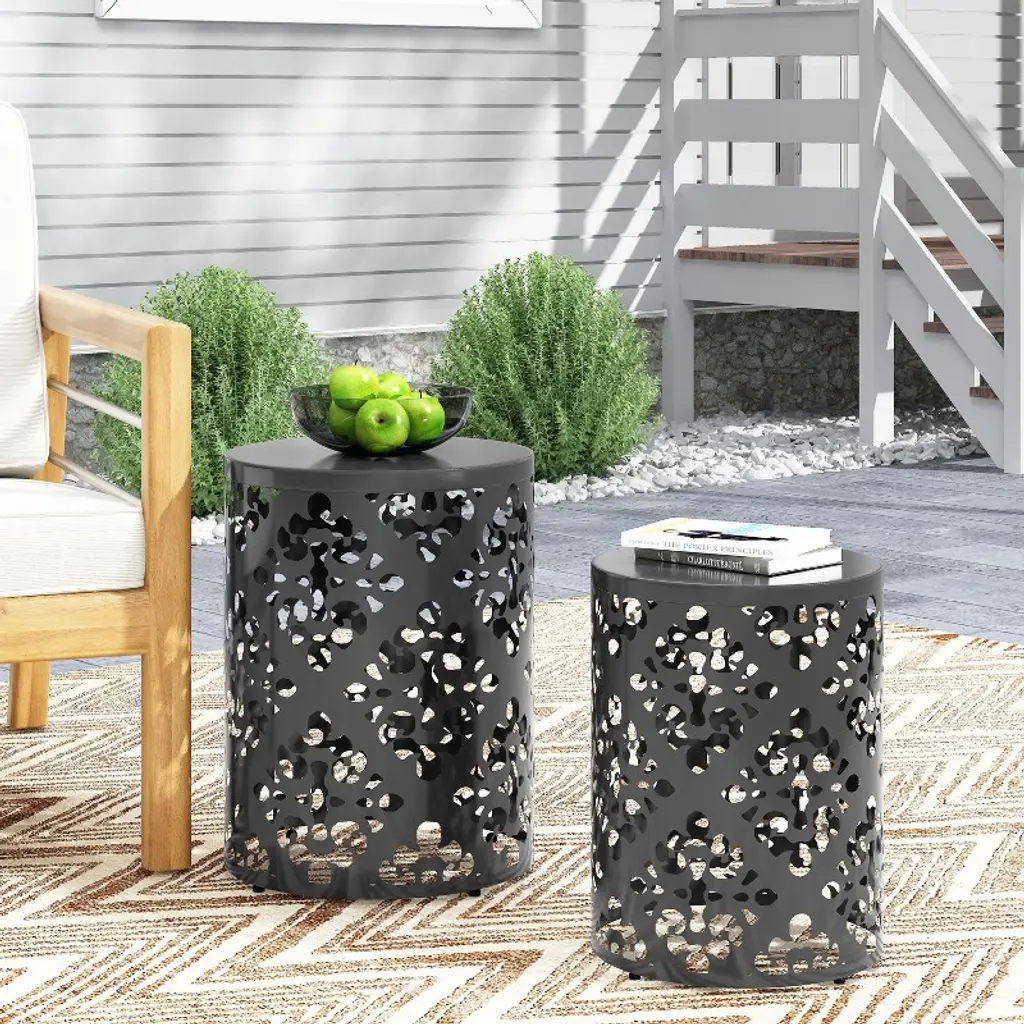 Elevate your outdoor space with the 3-Piece Stackable Iron Side Table Set, where timeless design meets versatile functionality. Crafted from weather-resistant iron with an elegant finish, these barrel-shaped tables feature intricate decorative design detailing, adding a touch of sophistication to patios, gardens, or balconies. The graduated sizes nest neatly when stacked, saving space, while the sturdy construction ensures stability on any surface. Perfect for holding drinks, plants, or decor, this set blends seamlessly with both modern and traditional outdoor aesthetics.