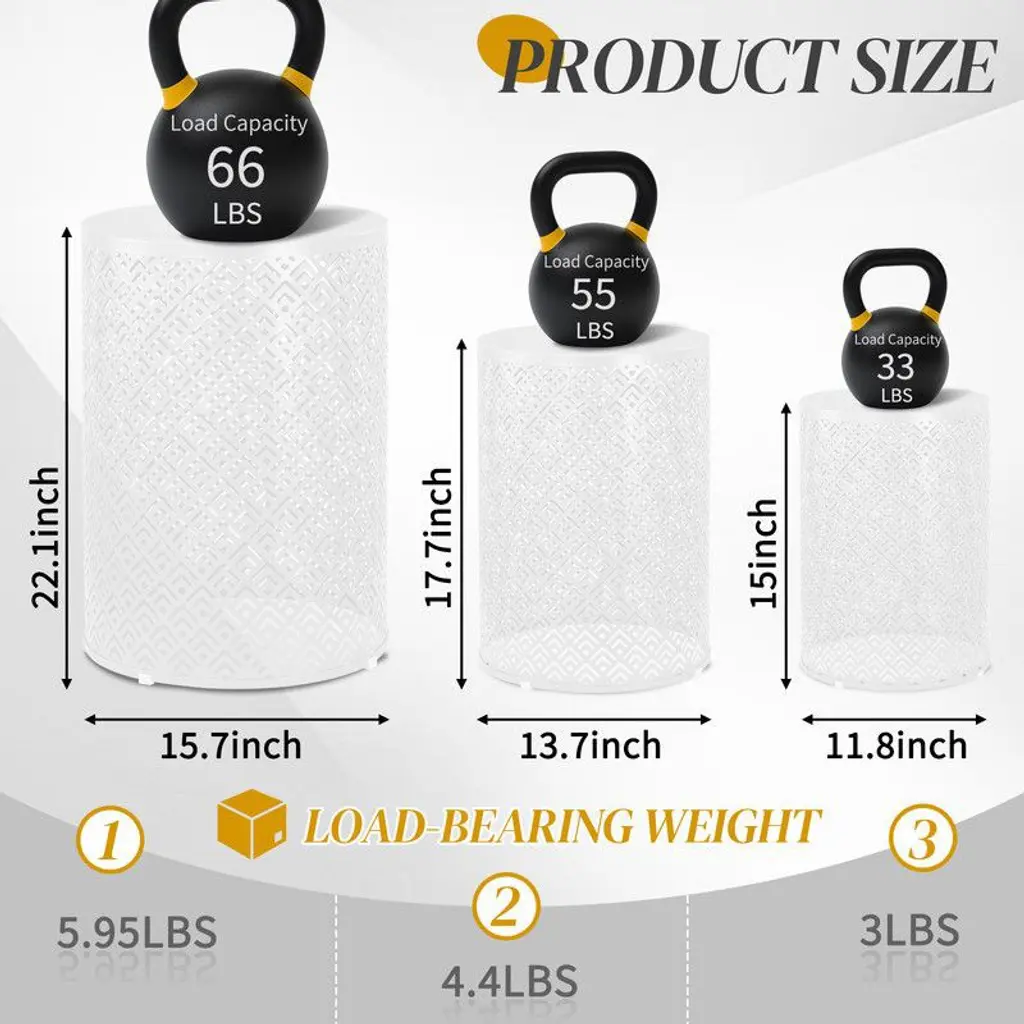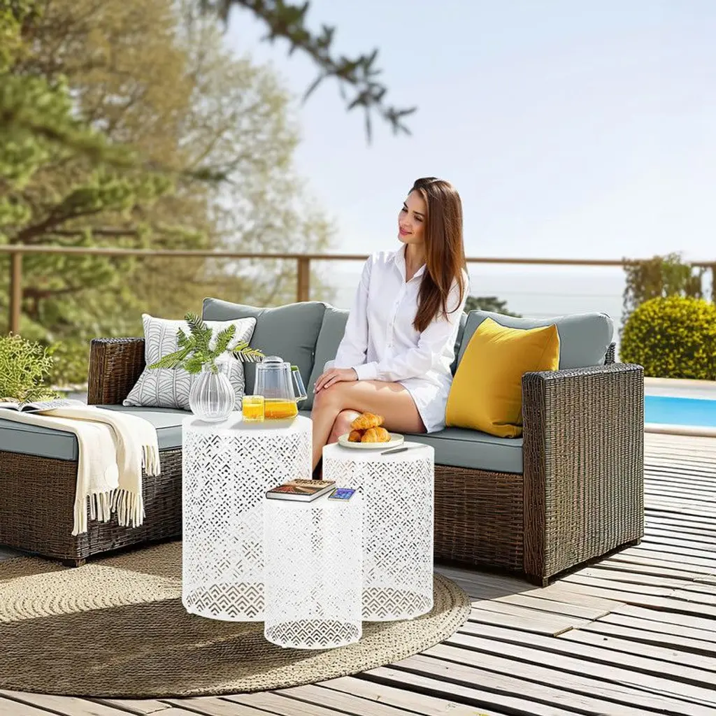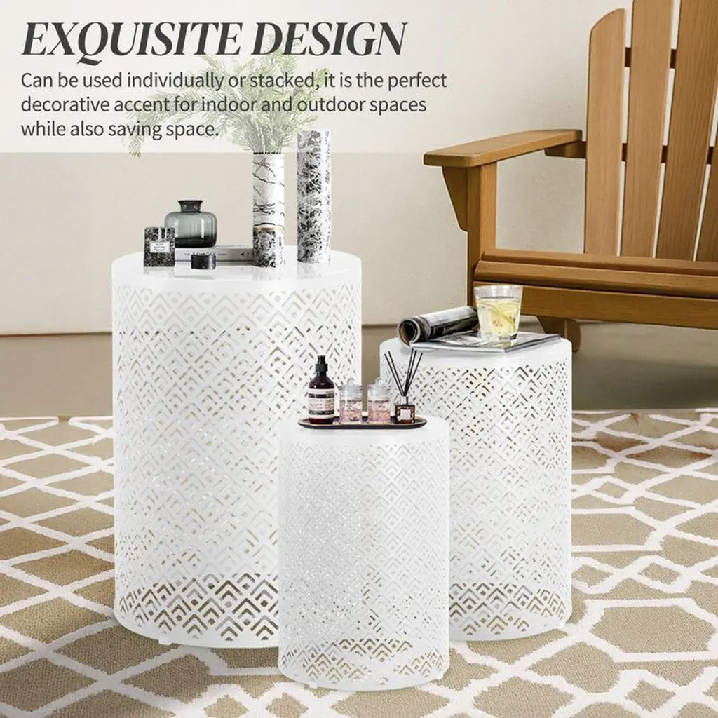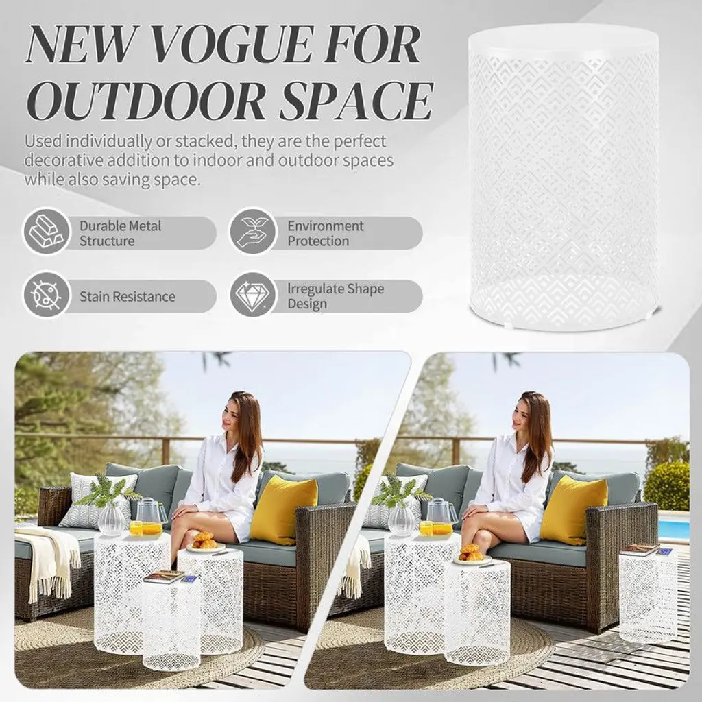 Elevate your outdoor space with the 3-Piece Stackable Iron Side Table Set, where timeless design meets versatile functionality. Crafted from weather-resistant iron with an elegant finish, these barrel-shaped tables feature intricate decorative design detailing, adding a touch of sophistication to patios, gardens, or balconies. The graduated sizes nest neatly when stacked, saving space, while the sturdy construction ensures stability on any surface. Perfect for holding drinks, plants, or decor, this set blends seamlessly with both modern and traditional outdoor aesthetics.