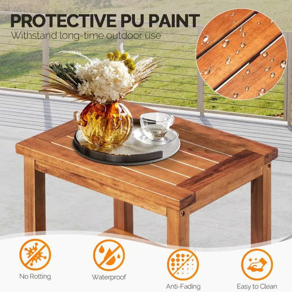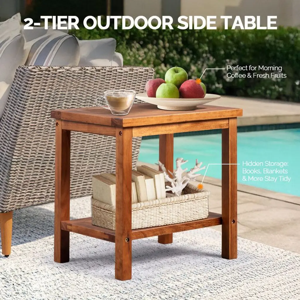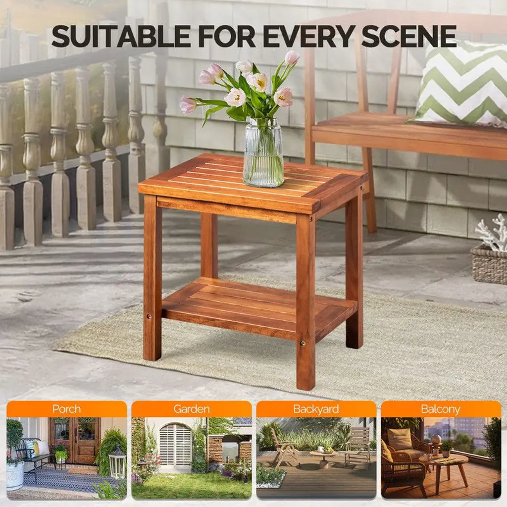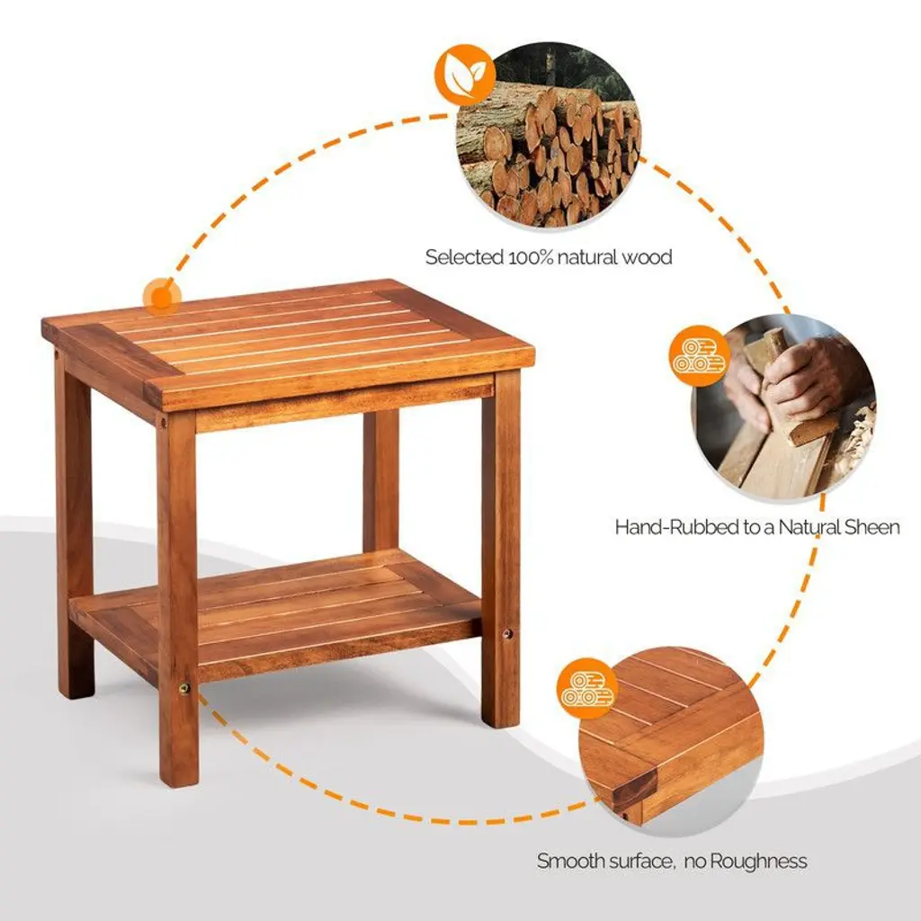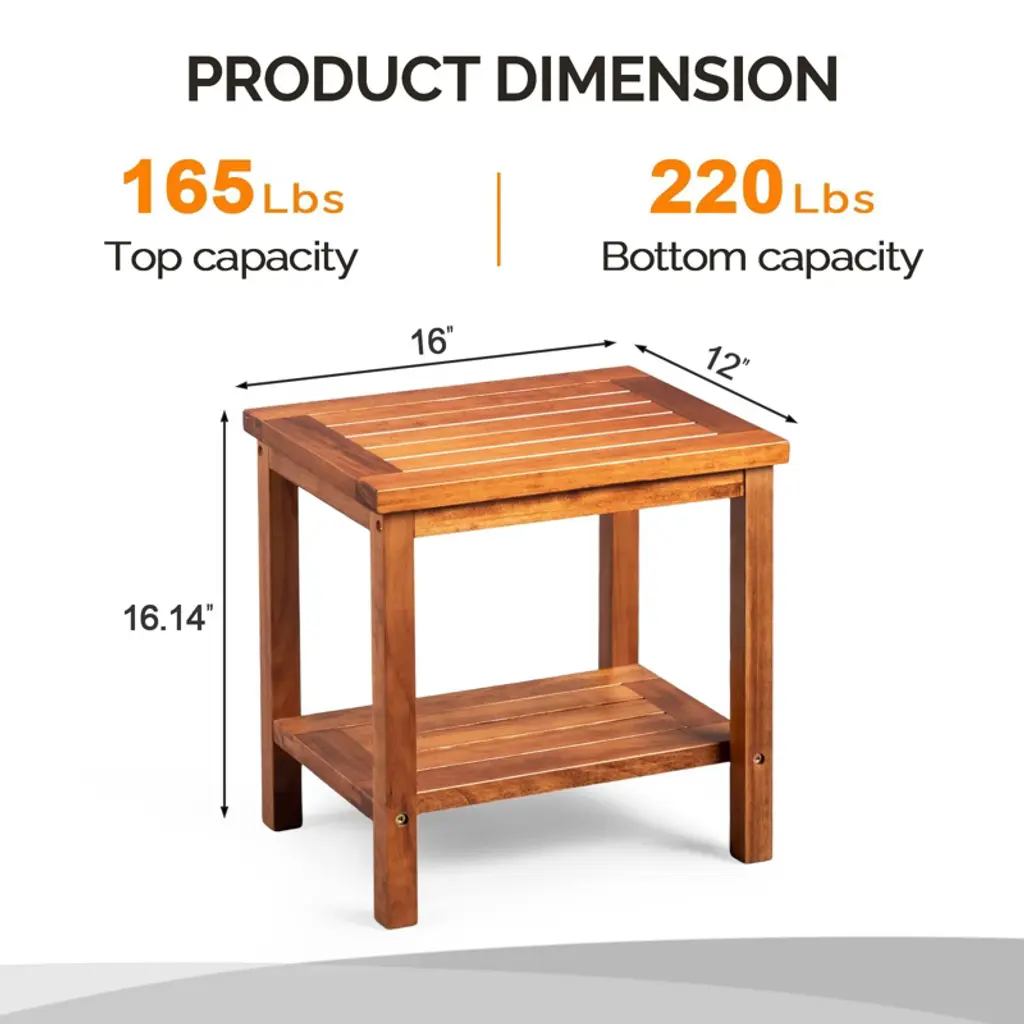 Bring natural charm and practical convenience to your space with this Outdoor Wood Side Table. Crafted from durable poplar wood, this compact two-tier side table offers excellent weather resistance and long-lasting stability. Measuring 16 x 12 x 16 inch, its double-tier design provides extra surface space for snacks, drinks, books, or decor—perfect for patios, balconies, living rooms, or poolside use. Lightweight and easy to move, this natural wood end table complements any rustic, farmhouse, or modern décor while offering simple elegance and daily functionality.