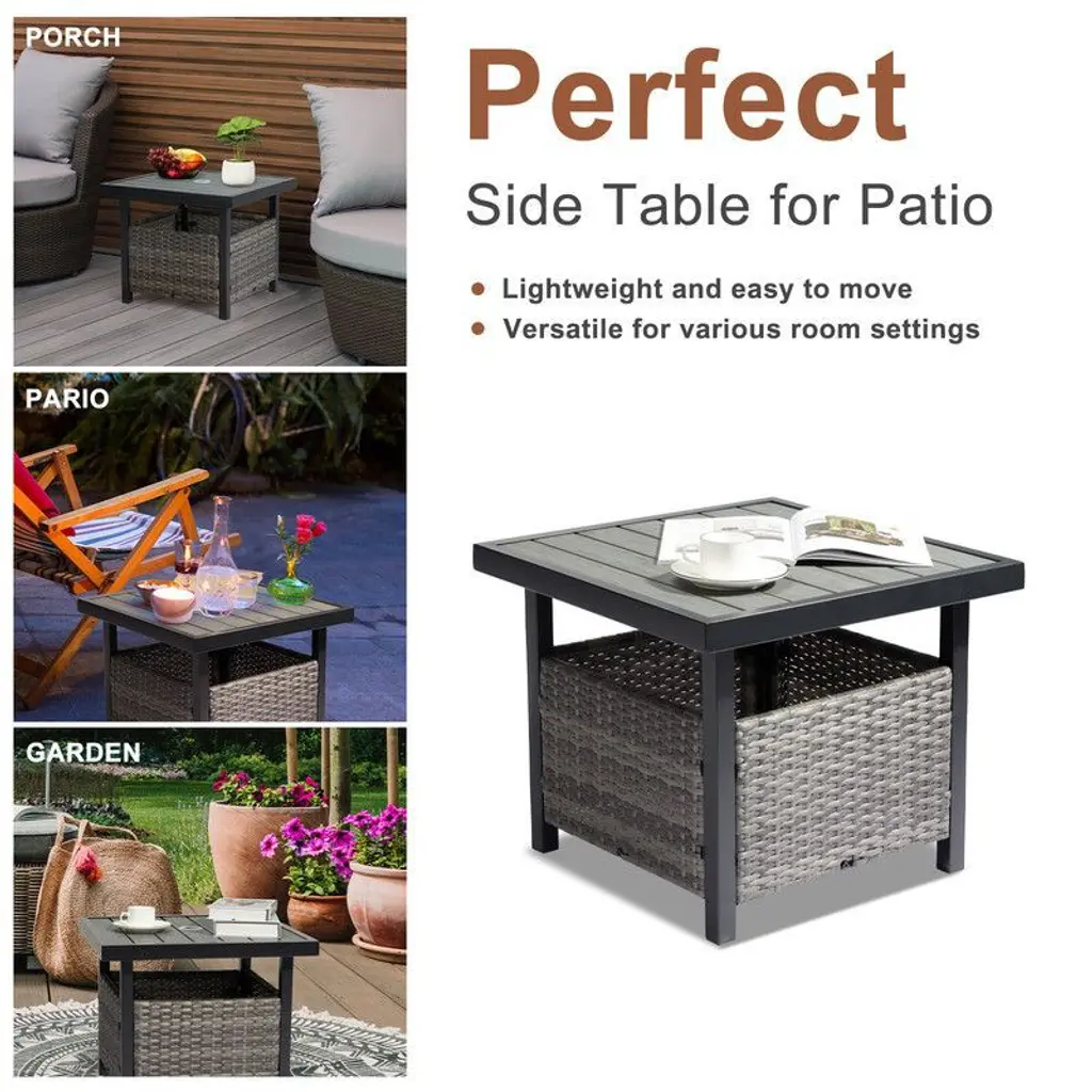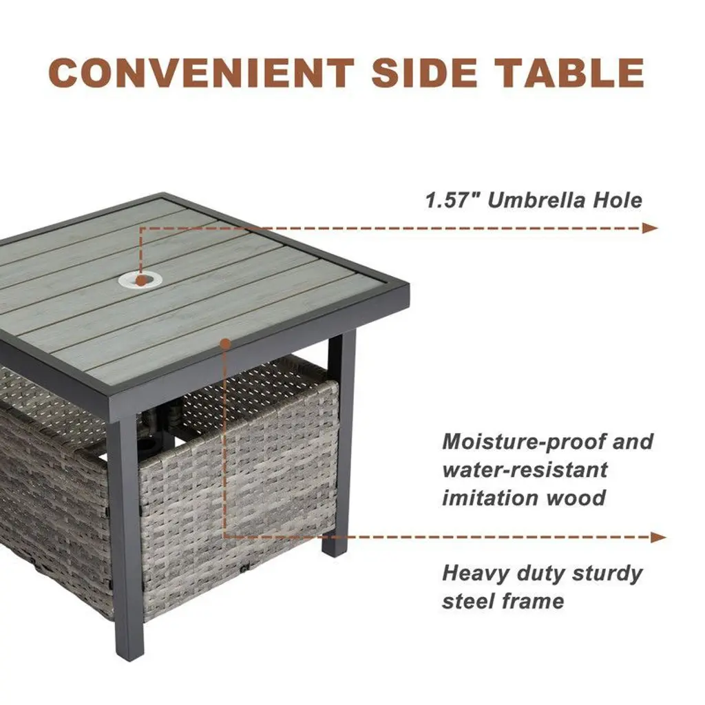 Enhance your backyard hangout space with our outdoor side table, designed to blend seamlessly with any patio, garden, poolside, or deck setting. Made with a heavy-duty steel frame and high-quality PE rattan, this table is capable of supporting up to 110 lbs. The square table top features a waterproof and moisture-resistant imitation wood material. And a central umbrella hole allows for shade on sunny days (umbrella sold separately). It's the perfect platform to keep your cold beverages or a bowl of snacks within arm's reach.