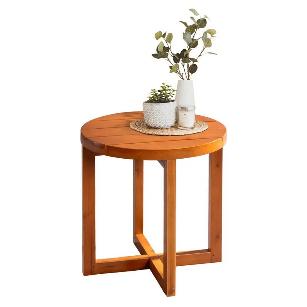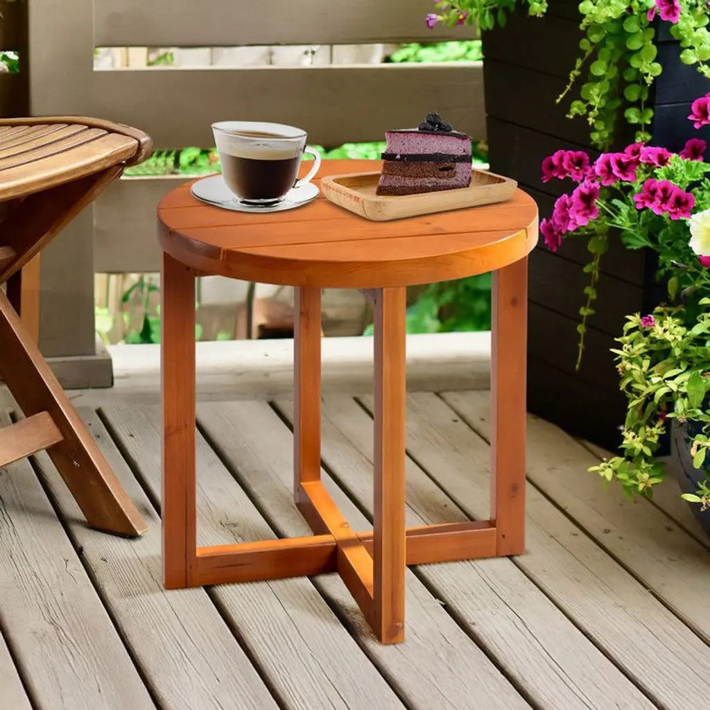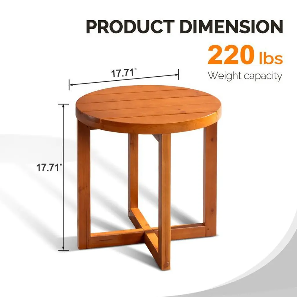 Add timeless charm and practical function to your outdoor or indoor living space with this 18-inch wood side table. Crafted from durable fir wood in a rich teak finish, it features a slatted tabletop and cross-leg base for enhanced style and stability. Lightweight yet sturdy, this compact table is perfect for holding drinks, snacks, books, or décor. Its weather-resistant design makes it ideal for patios, balconies, poolside areas, or cozy corners indoors.