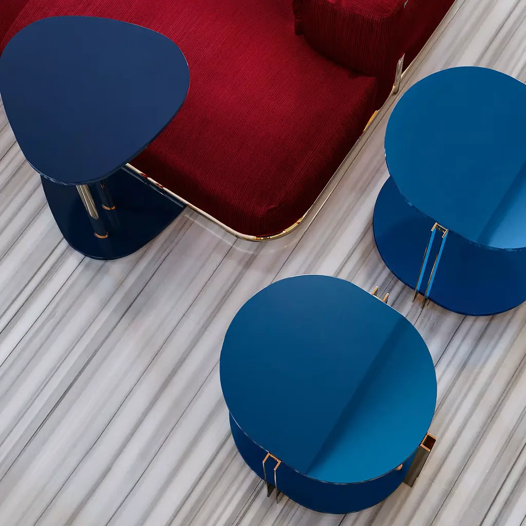 This side table from the Kassel Collection will infuse sophistication into any interior. Channeling a chic modern style, this side table is defined by an identical top and base in lacquered wood in a vibrant cobalt hue enclosed by three sections of chrome-plated stainless steel flat bars. Best paired with the lower version for a lounge or bedside table in a master suite.