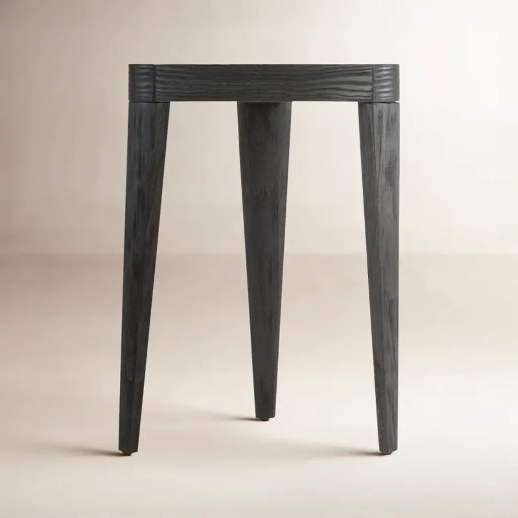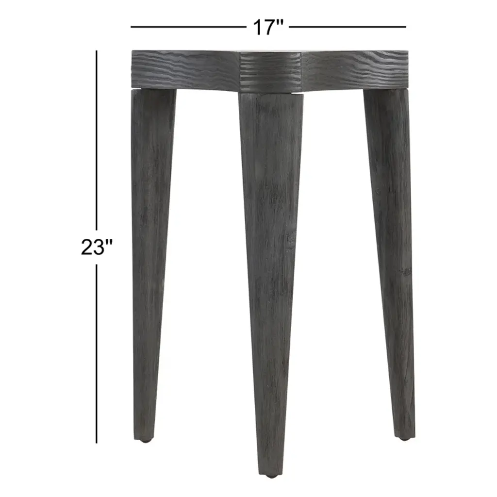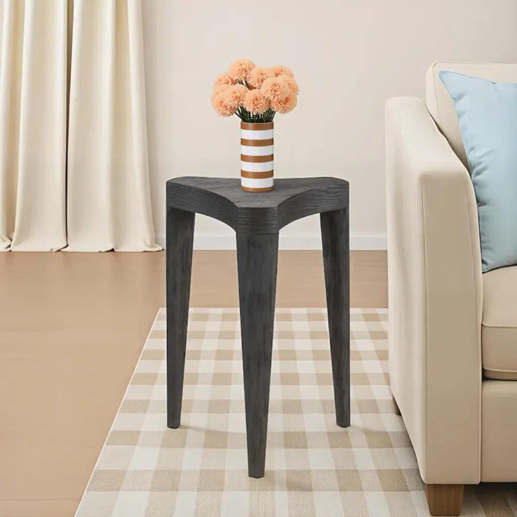 The perfect perch next to a sofa or side chair, the Katana accent table is crafted of solid wood with a beautifully grained veneer. The modern trefoil shape is balanced on three legs for a streamlined look. The blackened pine finish gives it a chic and sleek look.