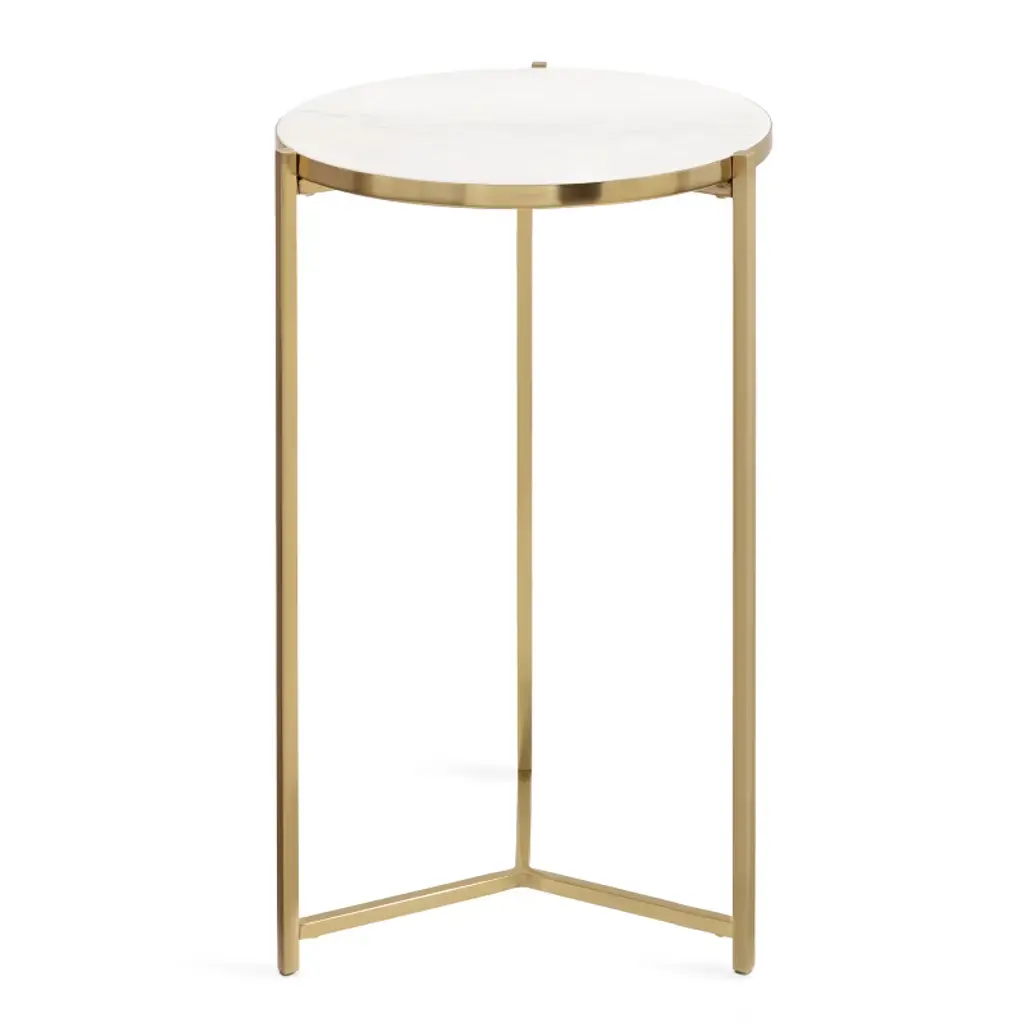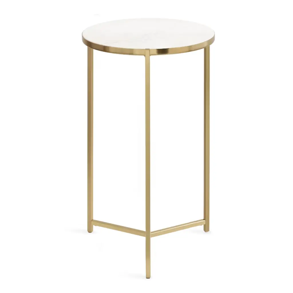 The Aguilar side table brings refinement and sophistication to your home with its premium design. This table features a metal frame with a glamorous polished gold finish, providing a sturdy base to secure the true hero of this accent piece: its magnificent marble tabletop. The Aguilar table has a round tabletop surface crafted from authentic marble, making each piece one-of-a-kind. This side table has a slim, compact design, with overall dimensions of 15 inches wide by 15 inches deep by 24 inches tall, with a 14 inch diameter tabletop. This table is ready to showcase small plants, some bathroom necessities, or your favorite cocktails and mixed beverages. In addition, each Aguilar table features rubber pads attached to each of the three legs to prevent your hardwood or tile floors from becoming scuffed or damaged.