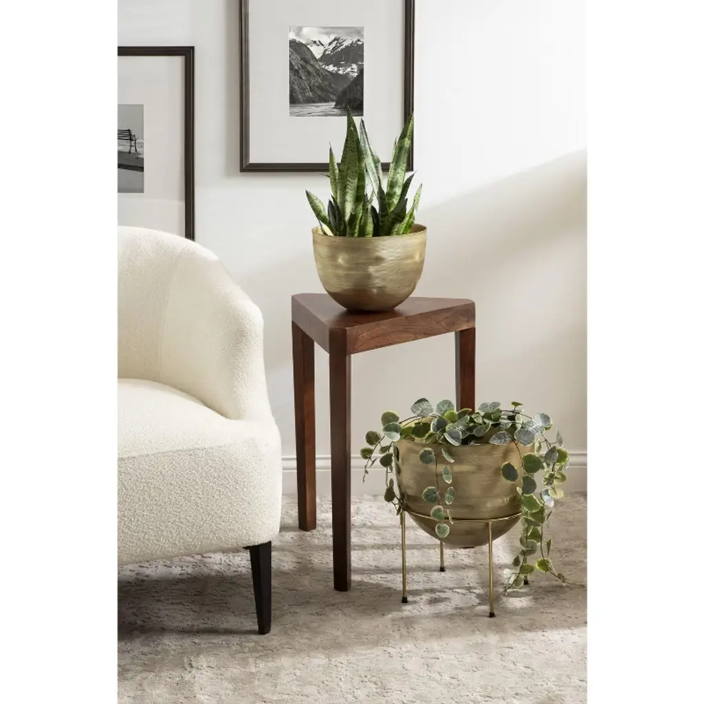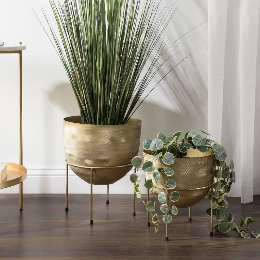 Give your home an elegant, modern quality with this unique and beautiful set of planters from Kate and Laurel. The Navara planter set was handcrafted in India, with a sophisticated engraving and satin black finish distinct from piece to piece. The pots are made of textured aluminum, while each base is made of sturdy and resilient iron. The Navara collection features two different sizes: The larger of the two planters has a 12-inch diameter and a height of 14.25 inches, while the smaller planter has an 11-inch diameter. with a height of 12.25 inches These elegant planters are perfect for adding some faux greenery to your floor, console, side table, or dresser. They're also fantastic for authentic plants, provided you have a plastic or burlap liner with plenty of coverage. You can also utilize the multifunctional Navara planters as catch-alls for household items such as keys, wallets, and more. Create a layered decorative display or spread them throughout your space for a cohesive home decor aesthetic.