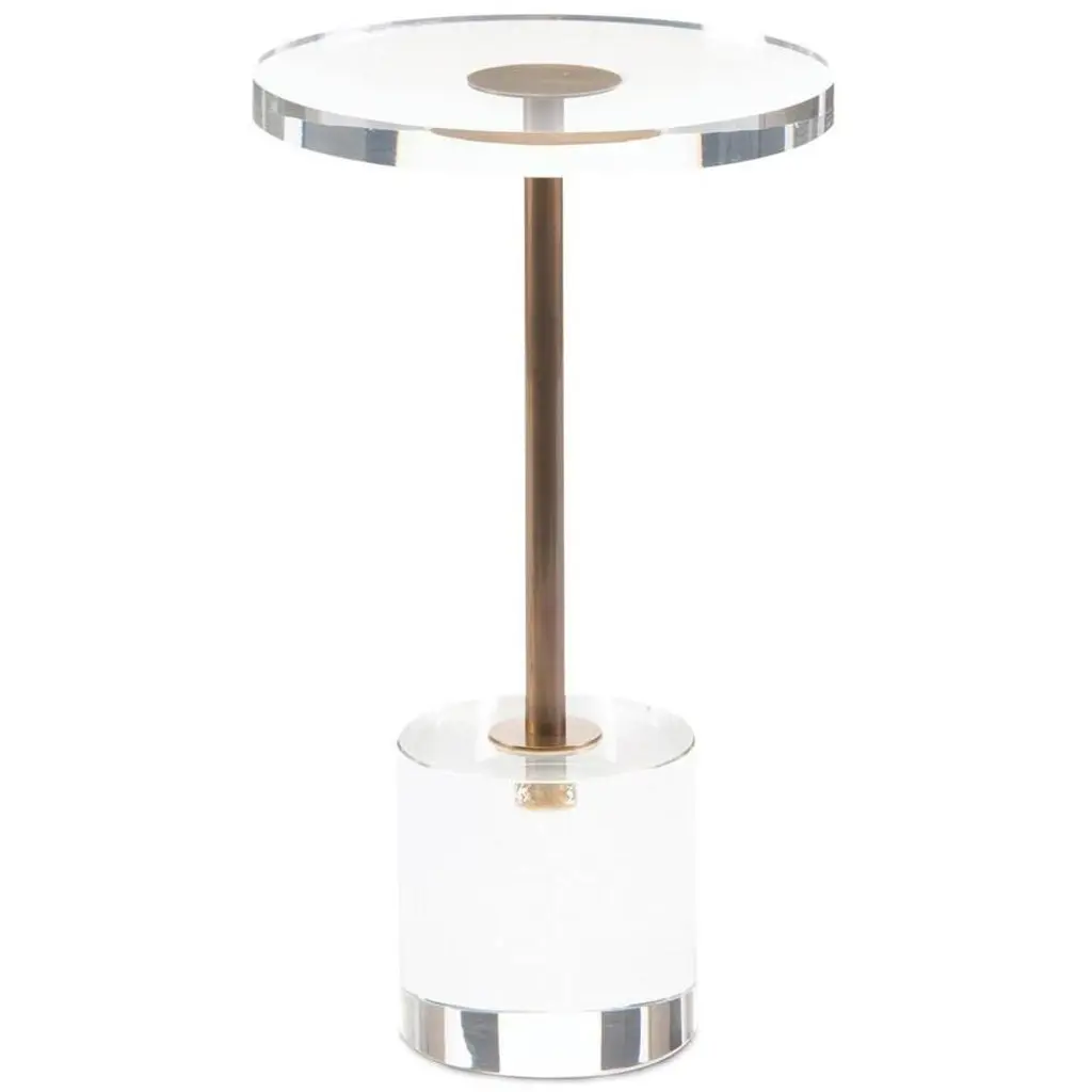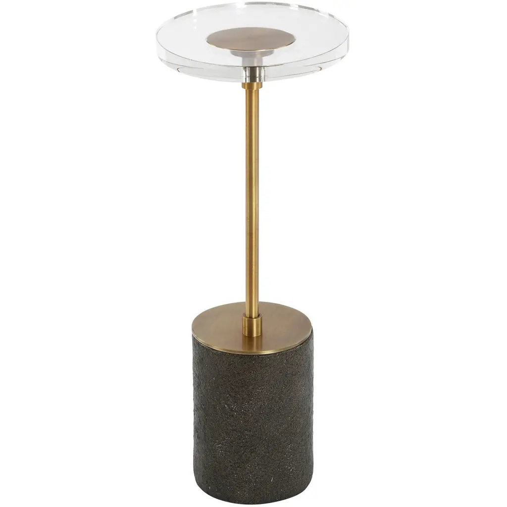 This Contemporary Accent Table Features A Thick Oval Crystal Slab Resting Atop An Antique Brass Metal Base And A Sleek Black Textured Resin Foot.