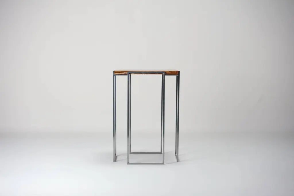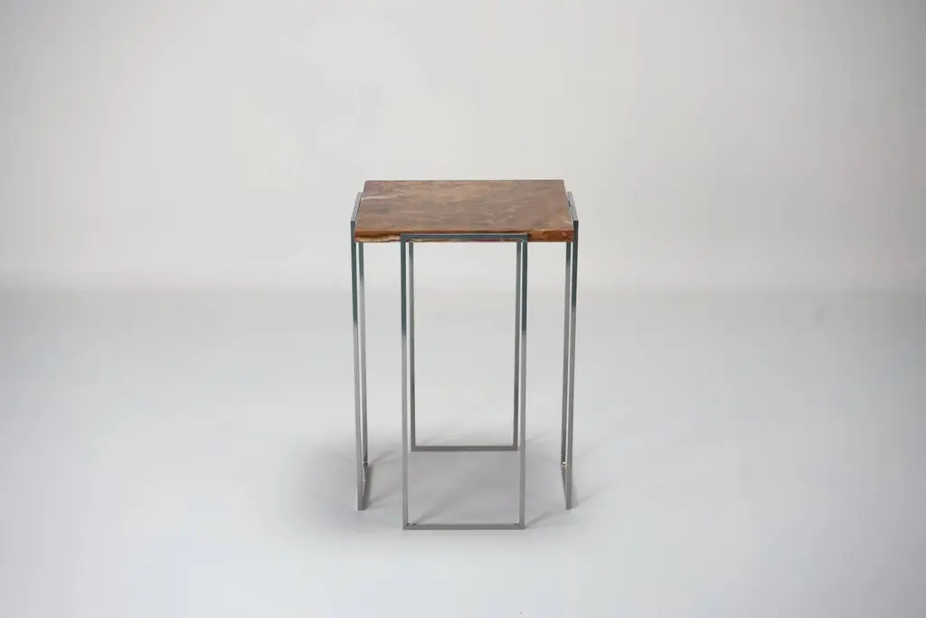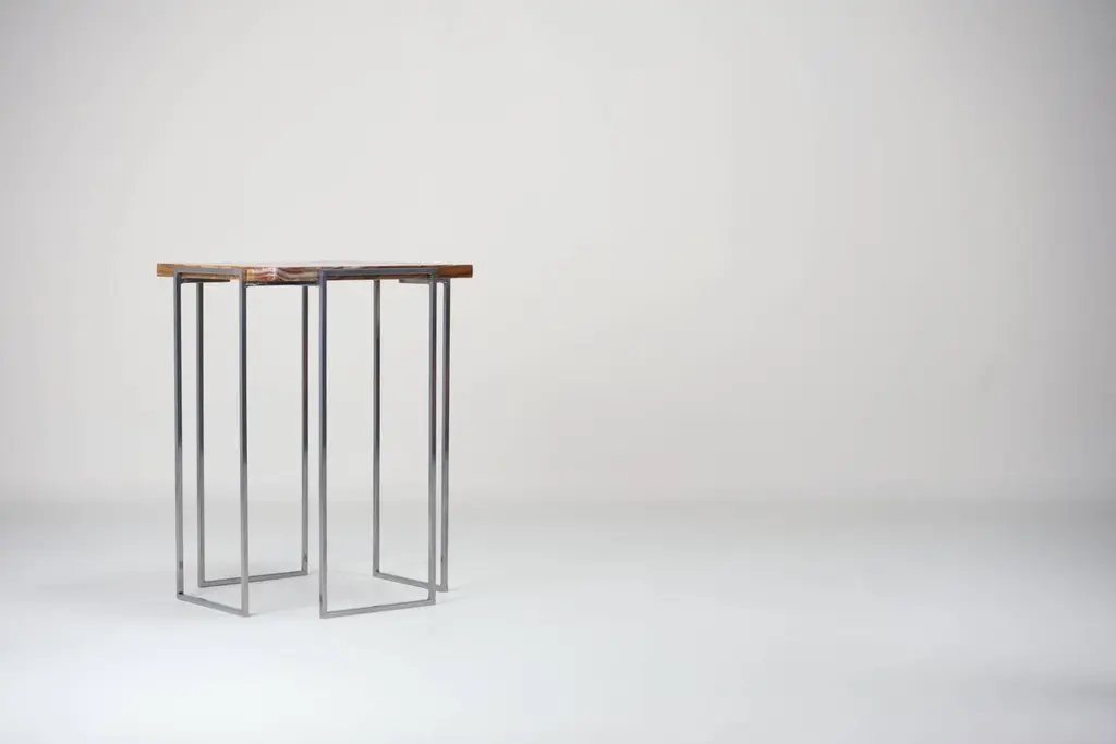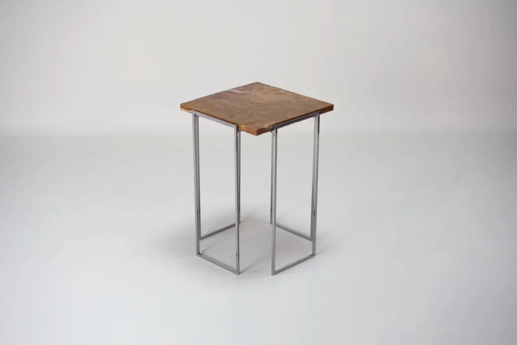 "Kaus cromo" is a highly functional and minimal side table, easily adaptable in any kind of interior space. It is made of powder-coated cromo steel and a top of the finest Persian Onyx. With thin bars used for the frame, it looks exceptionally light, but it marks its presence strongly.