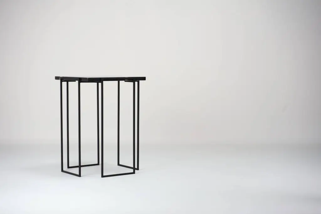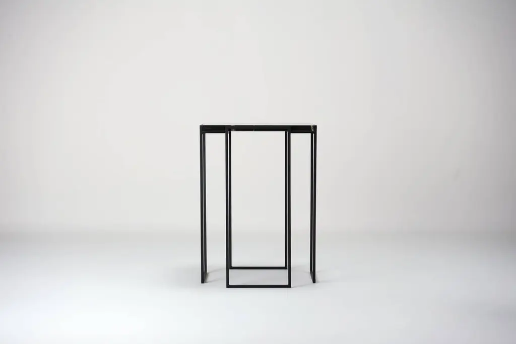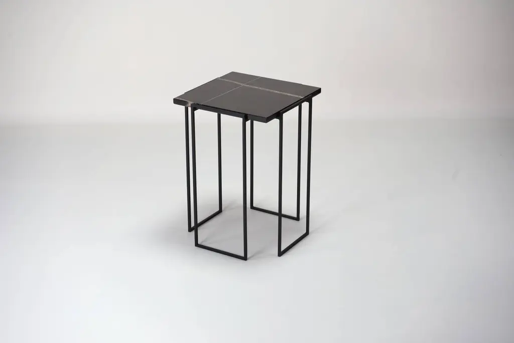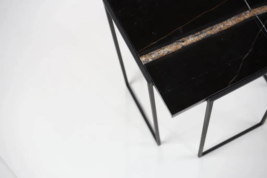 "Kaus" is a highly functional and minimal side table, easily adaptable in any kind of interior space. It is made of powder-coated steel and a top of the finest Sahara noir marble. With thin bars used for the frame, it looks exceptionally light, but it marks its presence strongly.