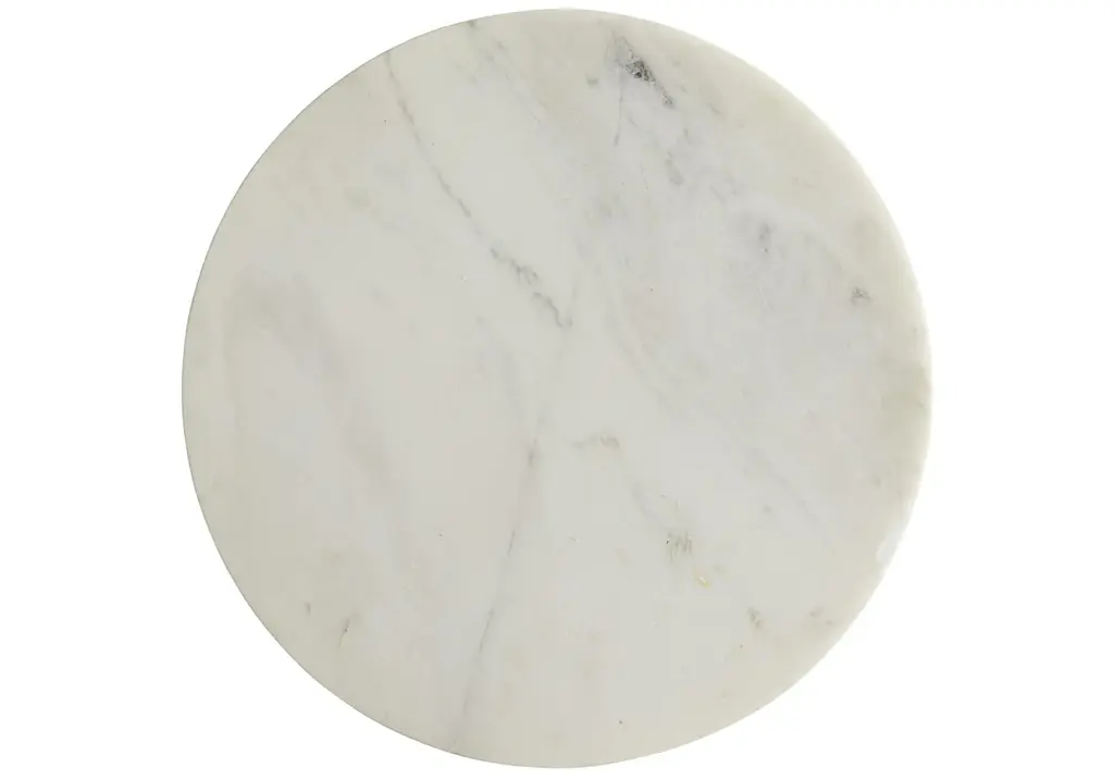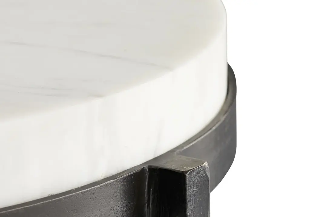 This side table lends a minimal, elegant look with its hand-forged iron frame featuring three elongated, tapered legs. A thick white marble top contrasts its black base, adding visual texture and sophistication. Its versatile size pairs well with sofas and chairs, easily adding a tasteful, elevated design.