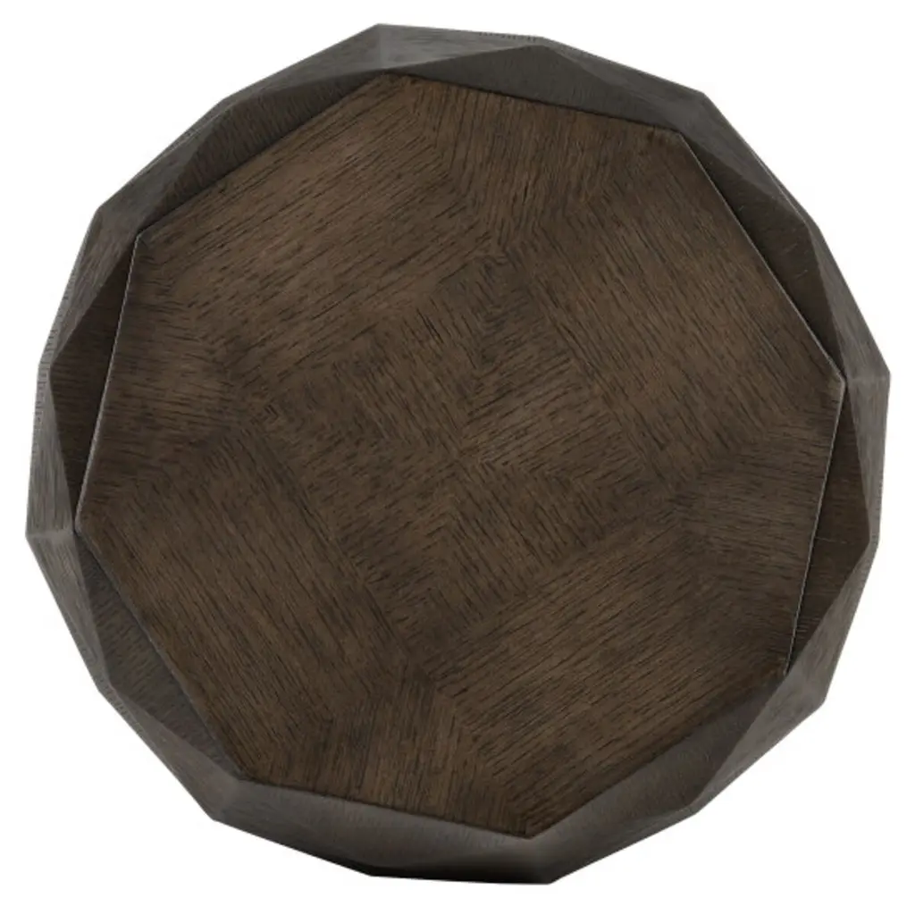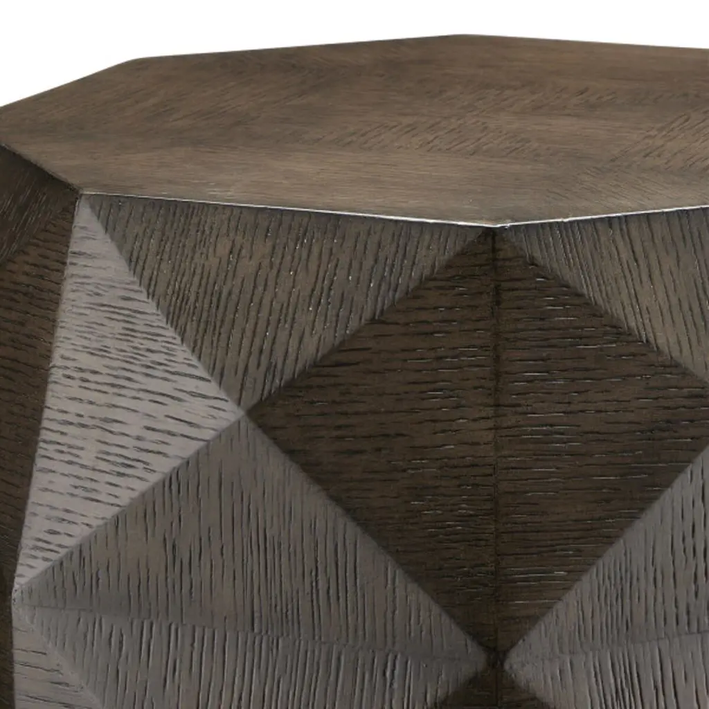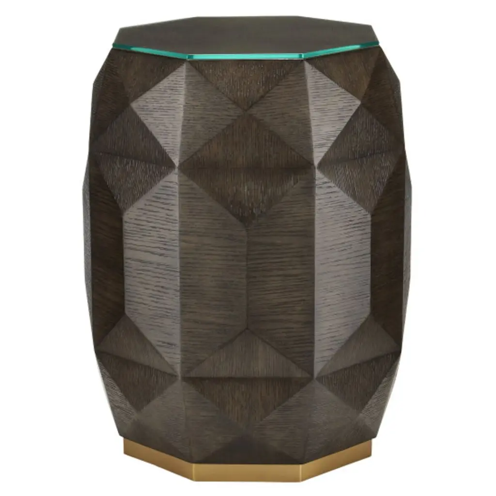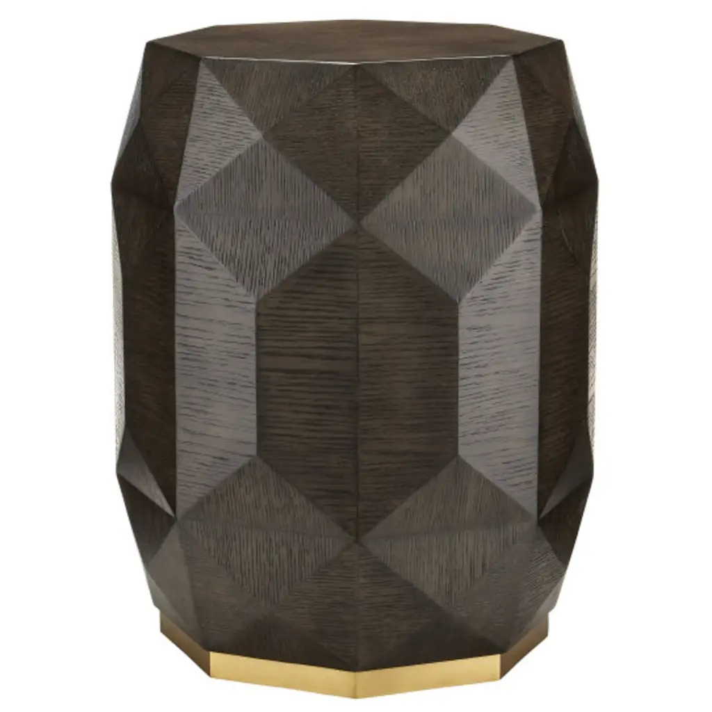 The Kendall Accent Table features an octagonal shape carved from oak solids, covered with facets of oak veneers that give it a jewel-like appearance. The surface is wire-brushed to accentuate the grain in the wood. The table sits on a plinth base made of metal in a polished brass finish, adding a glimmering touch to the warmth of this gem-like occasional table.