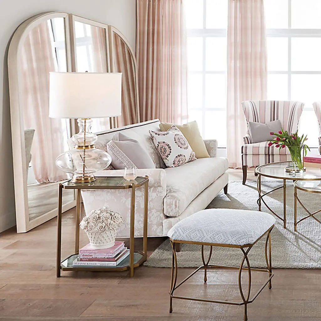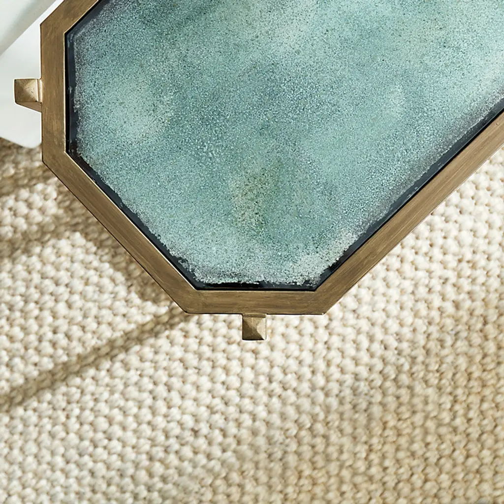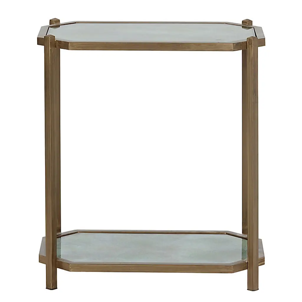 Big sculptural looks in a petite profile. Designed to nestle beside a chair or small sofa, our Kendall Side Table has two heavily antiqued mirror or verdigris glass shelves to reflect the light. Clipped corner details add architectural punch. Turn this small accent table to emphasize its width or depth to suit your seating. Kendall Side Table features: