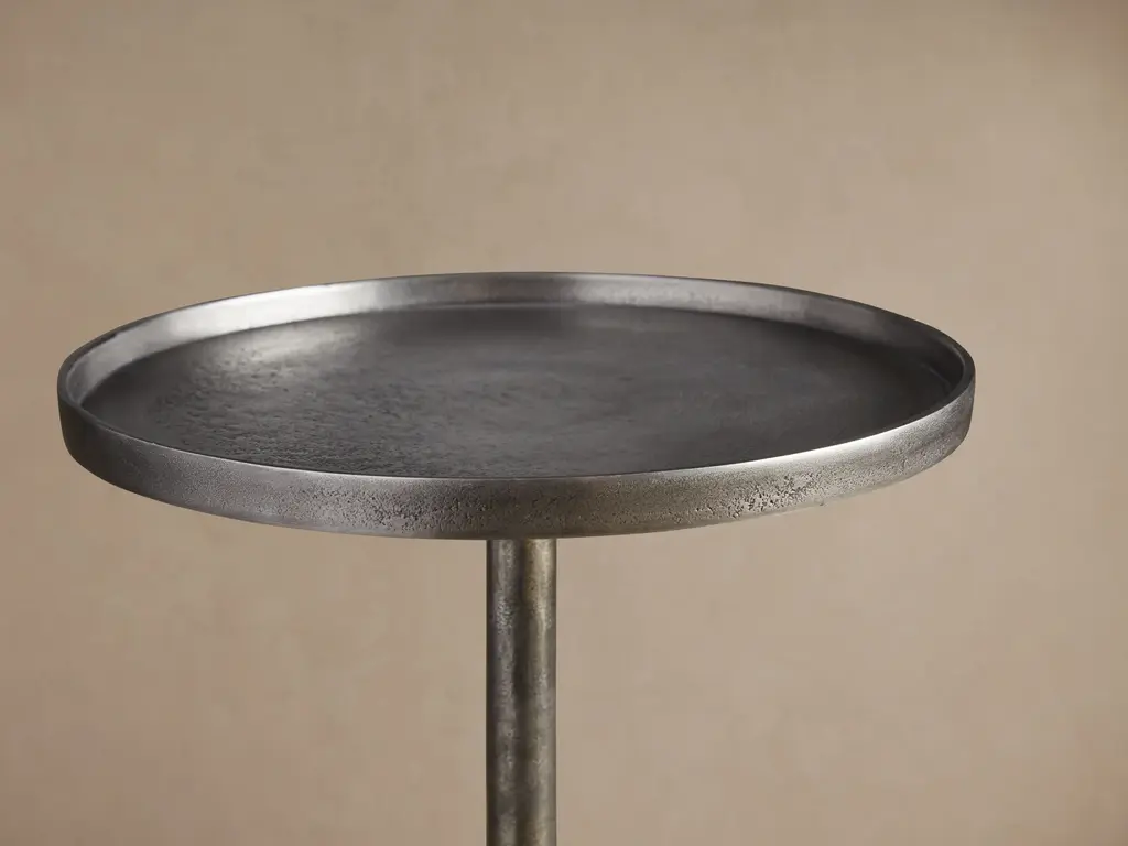 Handcrafted by metal artisans in India from cast aluminum, our Kenneth Martini Table Collection features a uniquely hand-antiqued and polished surface. Elegantly rustic patinas in varying shades and patterns make each minimalist table a true one-of-a-kind.