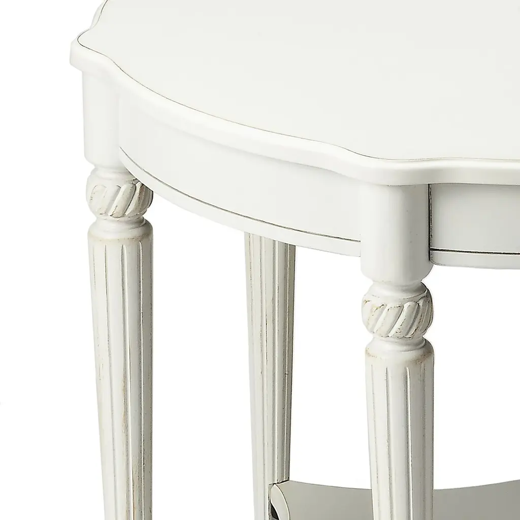 This elegant table blends classic Old World styling with today's casual sophistication. Crafted from solid woods and wood products, it boasts an ample round top with a distinctive lower display shelf, joined together by beautifully carved fluted legs.