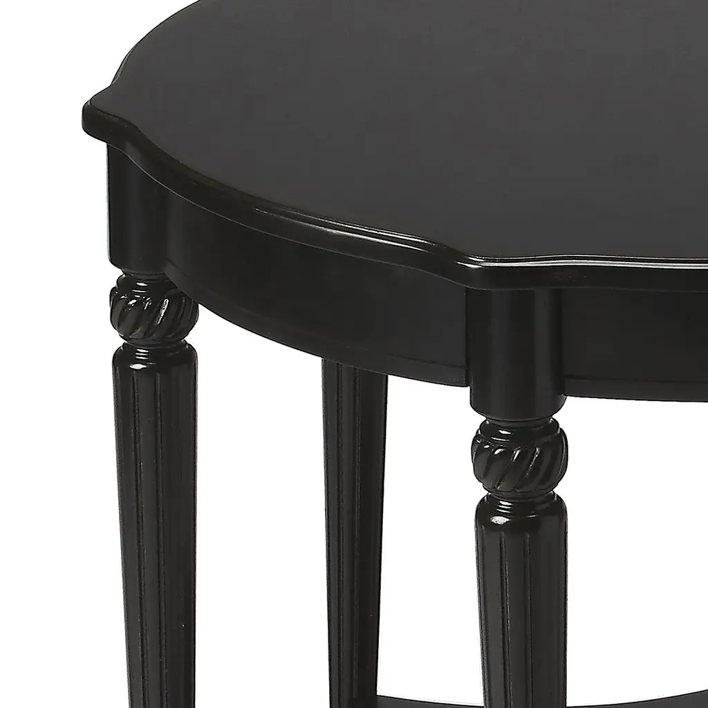 This elegant table blends classic Old World styling with today's casual sophistication. Crafted from solid woods and wood products, it boasts an ample round top with a distinctive lower display shelf, joined together by beautifully carved fluted legs.