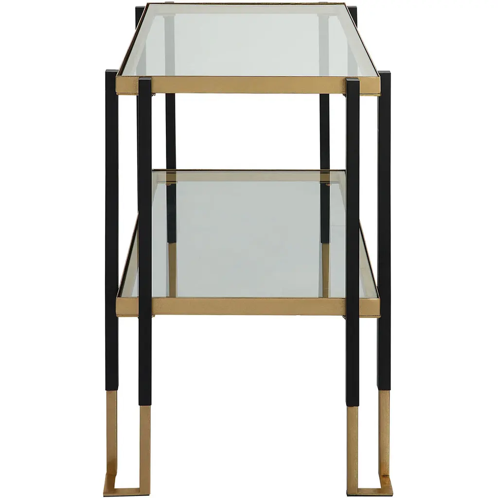 Featuring A Clean Lined Solid Iron Frame, This Contemporary Table Is Finished In A Two-toned Matte Black And Brushed Gold. Has Two Tempered Glass Shelves.