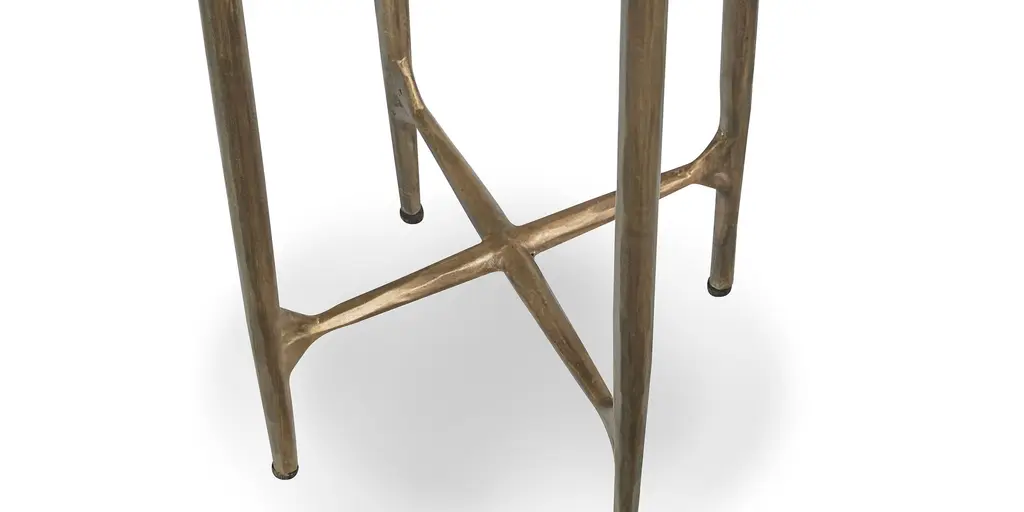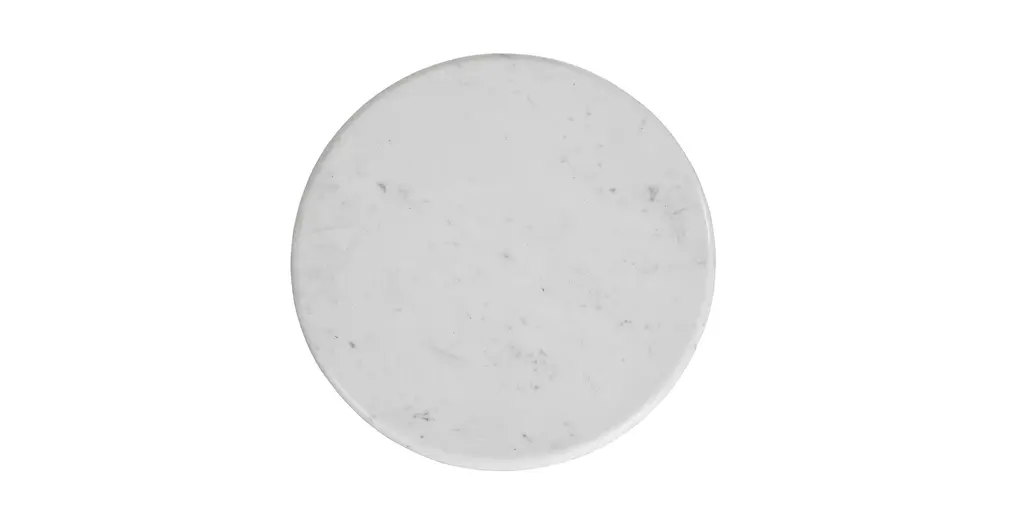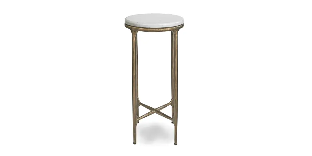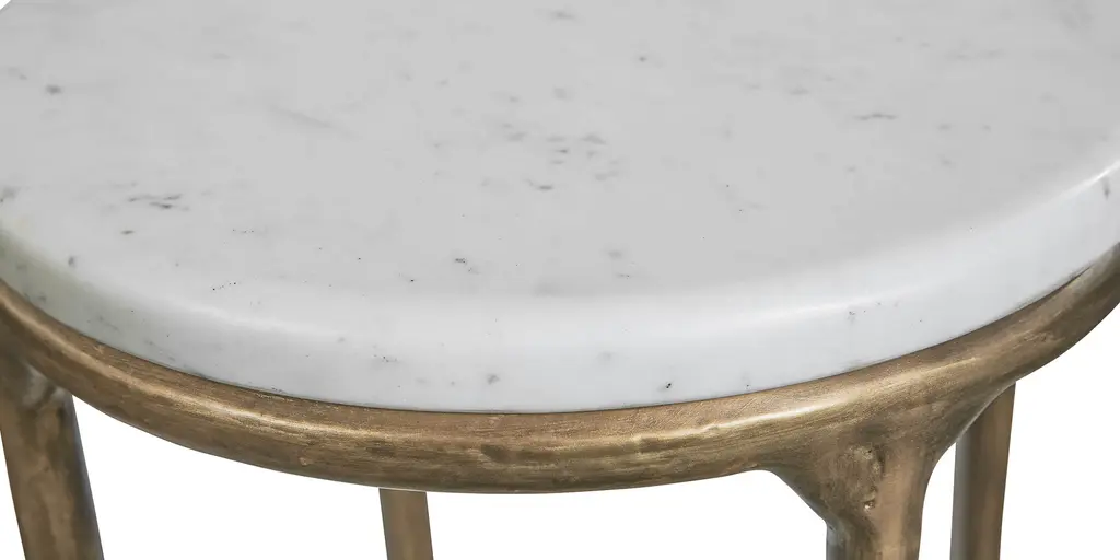 Youll find delight in the cool, rustic elegance of the Keswick round accent table. Its shiny white Bansawra marble top has a smoothed edge and natural streaks of grey, blush, and purple. Tall, slender legs taper to the floor, are powder-coated for easy maintenance, and are highlighted with a hand-applied distressed bronze finish. This highly prized Banswara marble table is sealed for protection, though coasters are still recommended.