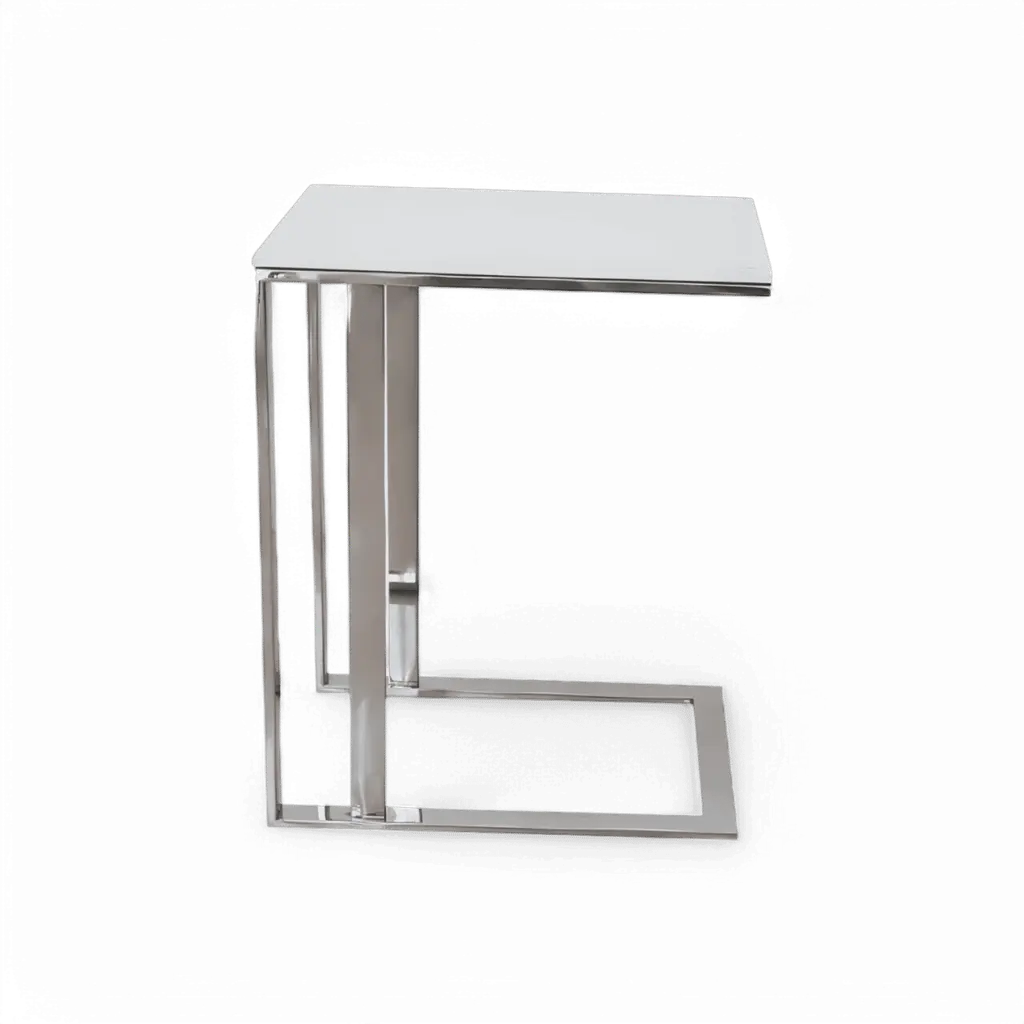 The Khloe Side Table in White highlights modern sophistication in any living room. A rectangular stainless-steel frame with two additional beams creates a solid foundation on which a white tempered glass top sits. Due to its unique design, this side table can easily adhere to any space. You will not be disappointed with the fascinating impression this table will give your house guests. Also available in Black.White Glass Top | Polished Stainless Steel Base | Weight Capacity: 25 lbs