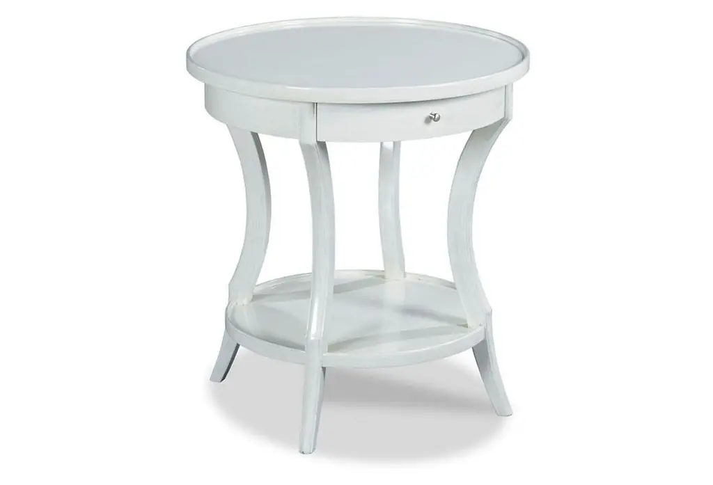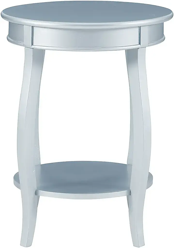 The contemporary silver round Maliory table with shelf is a convenient accent for any room of your home. A round lower shelf offers a convenient option for storing toys, magazines or your favorite books. Made of select hardwoods and solid wood materials, the contemporary styling of this table has a bentwood skirt and four saber cabriole tapered legs. Customer assembly is required.