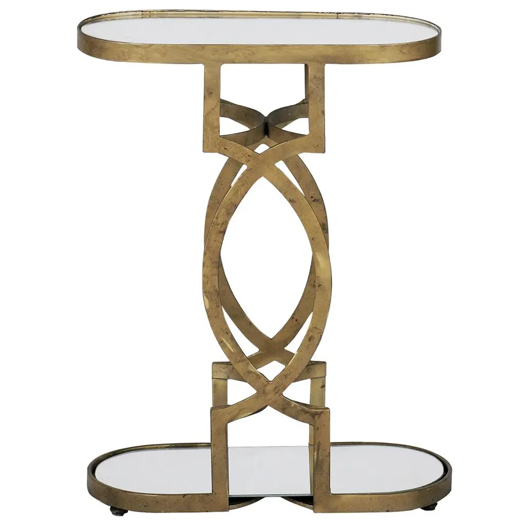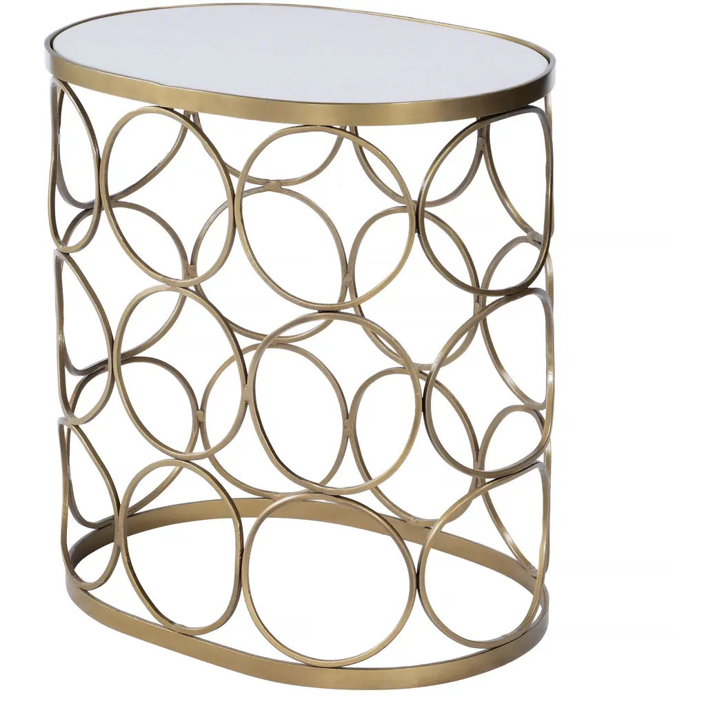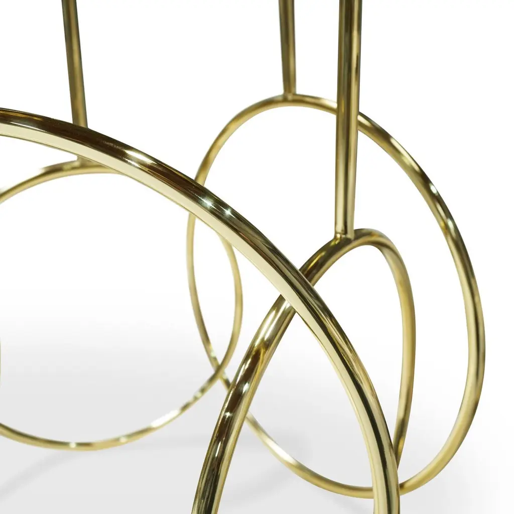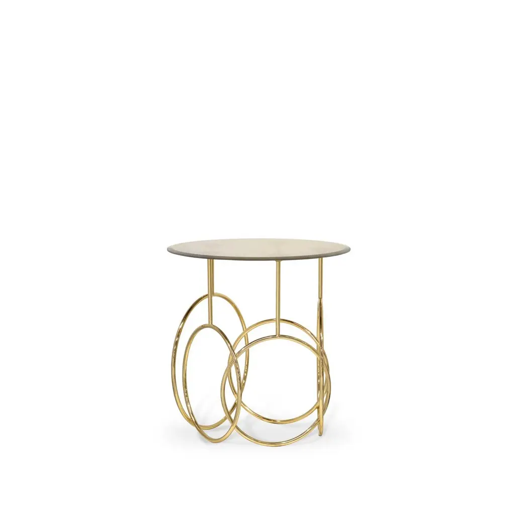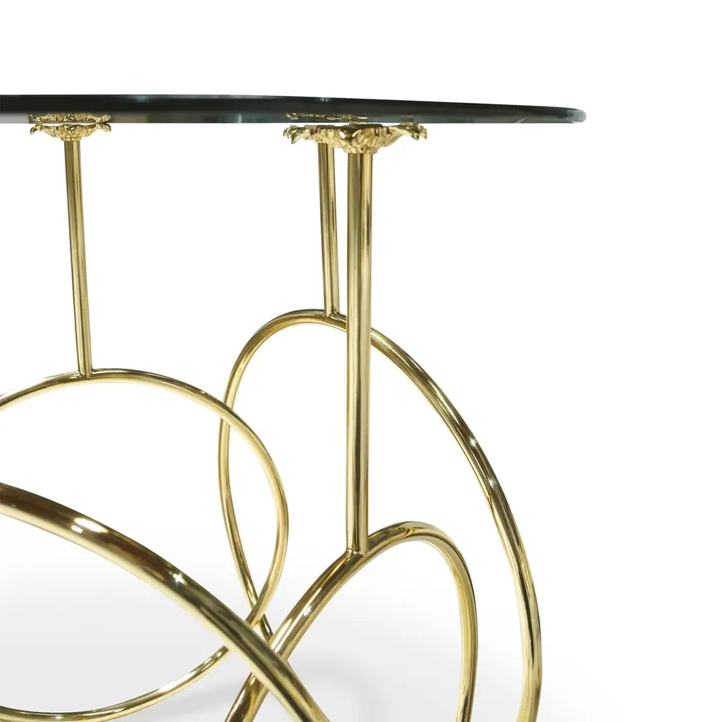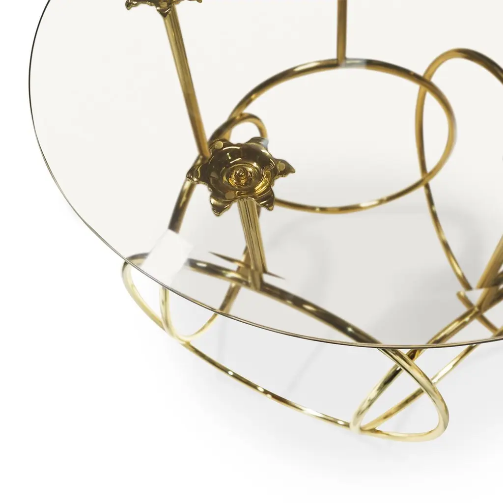 The Kiki side table evokes the romantic and seductive beauty of Parisian cabaret life. The revealing frilled undergarments, the surprise high kicks, the mesmerizing hoops accompanied by blinding splendor give this table a sassy new spin on design. Polished hoops with delicate iris blooms as tips, support a glass top.