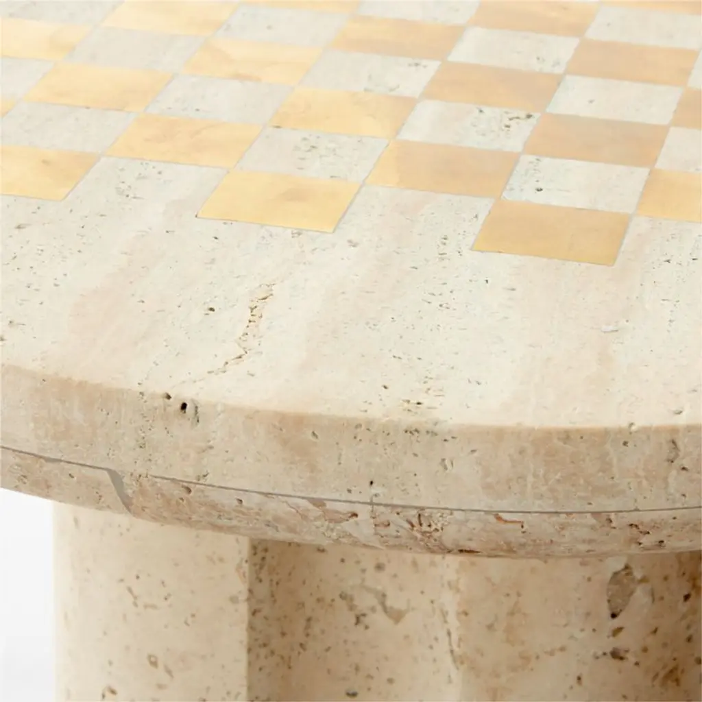 Designed by London-based Studio ANANSI with a minimalist sensibility, travertine game table makes a striking statement. Crafted of honed white travertine with an unlacquered brass inlay, the table is characterized by two carved cutouts on the base. Perfect for chess or checkers, the table's smaller scale makes it easy to style as a side table when not in play. Pair with the brass chess set. CB2 exclusive.
