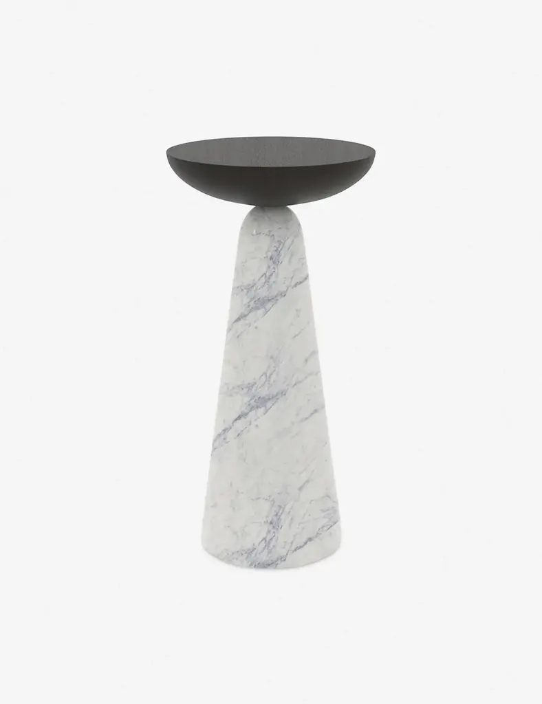 A wooden tabletop sits on a tapered marble base in this well-balanced side table. The variegated marble and natural wood grain create a stunning mixed-material contrast that offers endless textural and visual appeal in a small end table design.