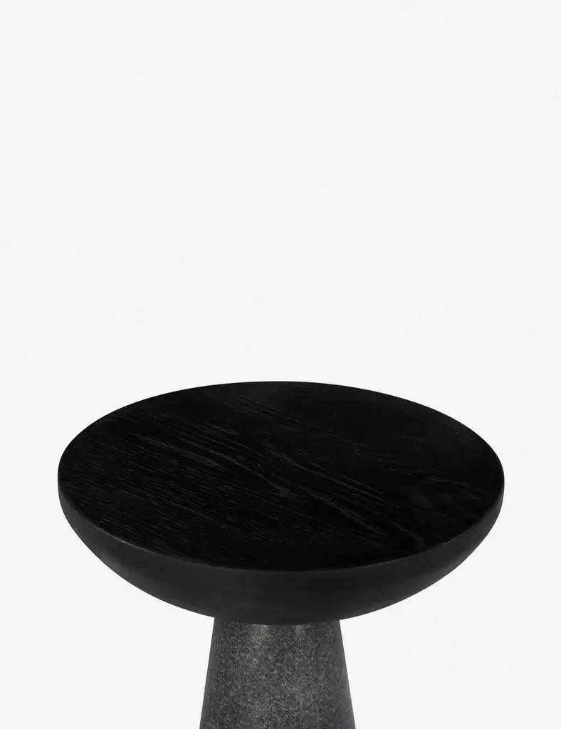 A wooden tabletop sits on a tapered marble base in this well-balanced side table. The variegated marble and natural wood grain create a stunning mixed-material contrast that offers endless textural and visual appeal in a small end table design.