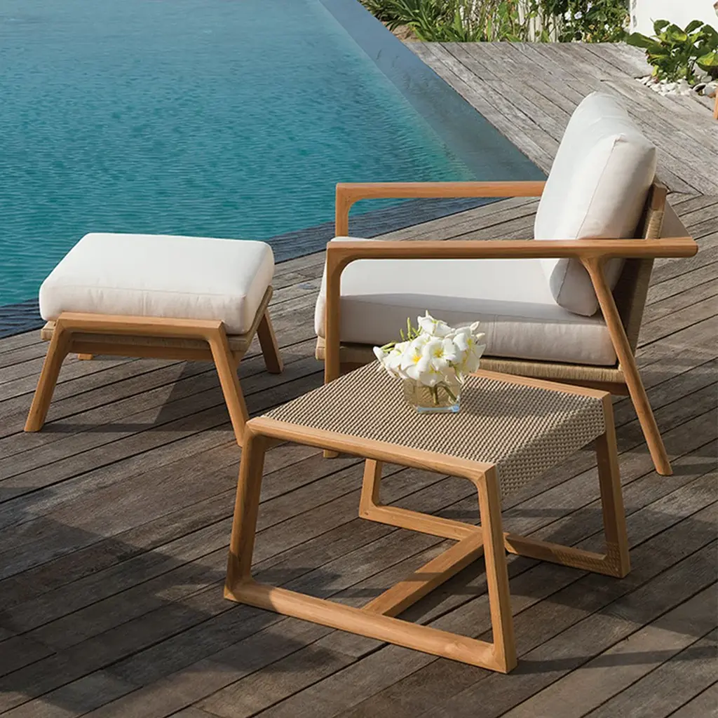 The Hana Collection intertwines modern aesthetics with timeless craftsmanship. Solid Grade A teak frames are complemented by the contrasting texture of Sisal all-weather wicker. Dining chairs are beautifully contoured and offer a comfortable dining experience without the need for added cushions. Enhanced by sling seat decks beneath the cushions, the lounge pieces invite moments of sheer relaxation. Designed by Andrew Gower. Please Note: Kingsley Bate fabrics, canopies, cushions, covers, special order sling colors, and special order finishes are considered customized and may have longer lead times. These items cannot be cancelled, returned, or exchanged.