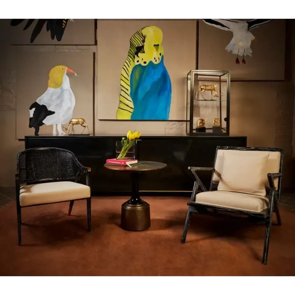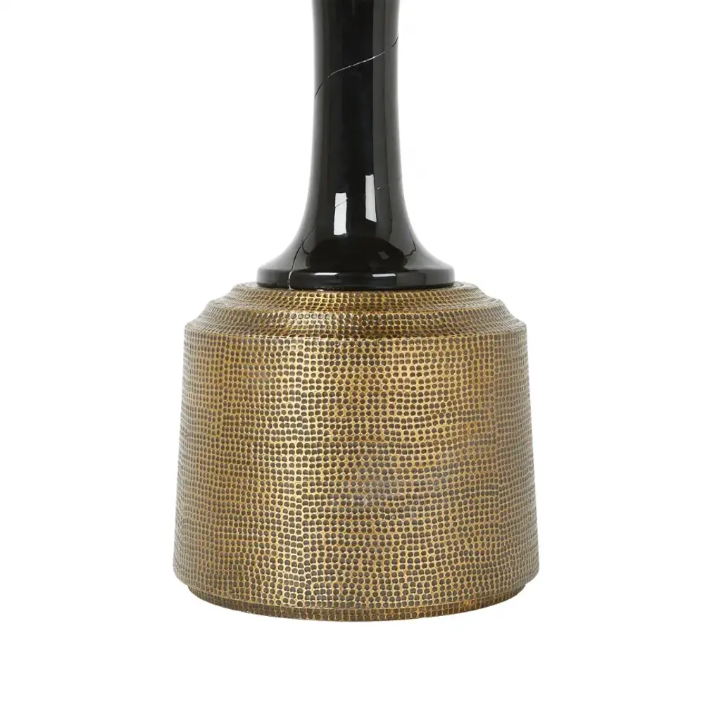 A swanky statement piece that’s bold yet refined, the Klein Side Table can transform any room into a luxurious lounge area. Just turn on the jazz. Its glamorous design enlivens Art Deco elements with a dose of industrial cool, showing off a meticulously hand-hammered top and base of metallic antique brass. At its center is a lustrous lacquered pedestal that flares out to form an elegant curve. The rich contrast of black and brass makes a striking impression in sleek cosmopolitan spaces or tastefully plush decor schemes. Floated between two lounge chairs, the Klein sets the stage for drinks and conversation.