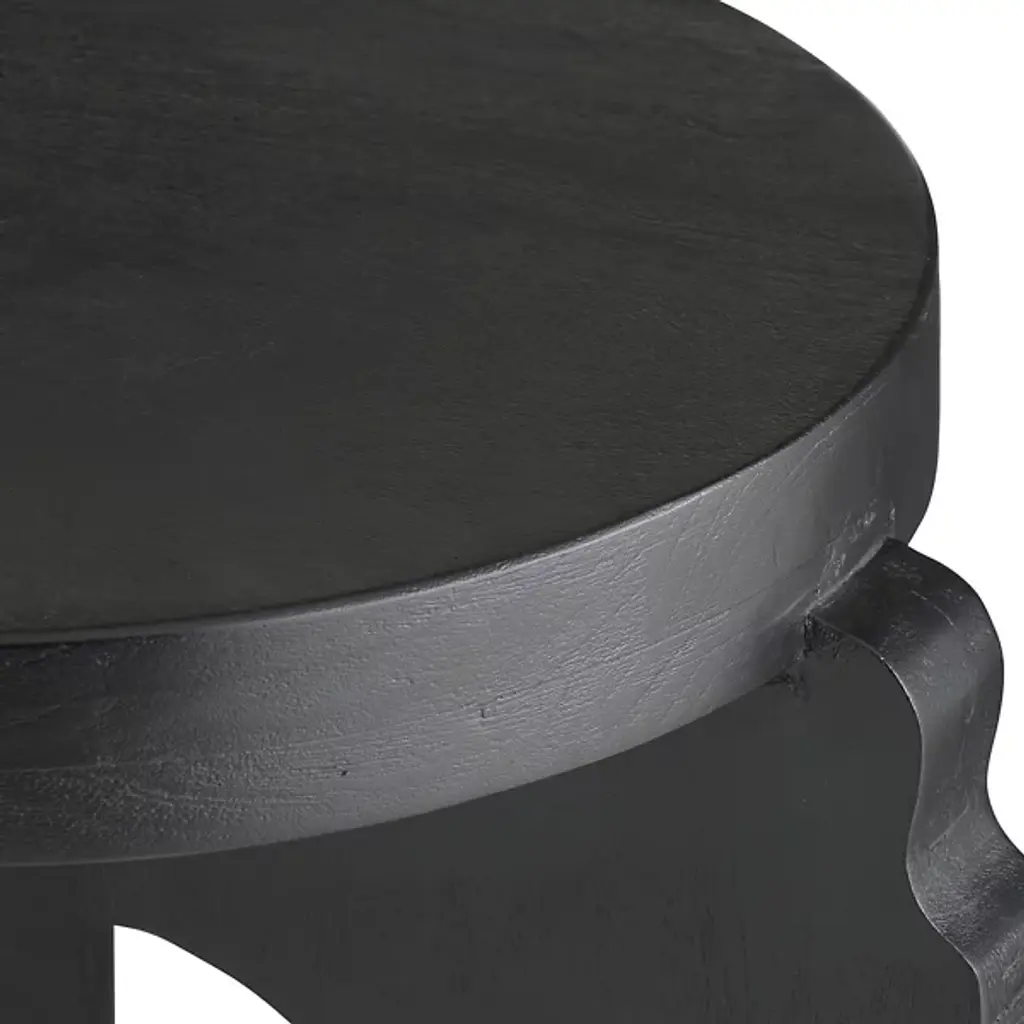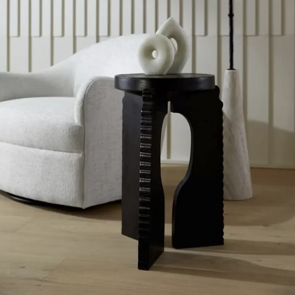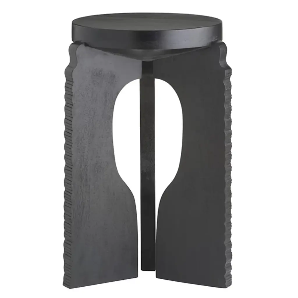 The Knight Accent Table from Arteriors is inspired by chess pieces, as evident through its carved mango wood legs that echo the shape of a knight. These sculptural supports create an unexpected foundation for the thick, rounded tabletop above. The handcrafted appeal becomes evident in the wood's natural grain patterns and the artisanal carving work. Positioned in reading nooks, beside accent chairs, or as a distinctive piece in entryways, this table brings personality to spaces that benefit from furniture with narrative character rather than purely functional designs.
