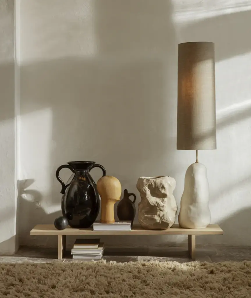 Made to complement the Kona Bed. The Kona Side Table in oak veneer peeks out from under the bed frame to provide a practical platform for a book, lamp and glass of water. The Japanese-inspired design is elevated above the ground to the perfect height. But it doesn't have to stay in the bedroom: use it to display objects on in a living room or bathroom. Embrace the art of ’low living’ with the Japanese-inspired Kona Low Table + Kona Display Table. With its simple and elegant construction, the design is elevated just above ground to the perfect height. Use it to display plants, books and your favorite objects or as a coffee table for when you’re lounging on cushions or on the floor.