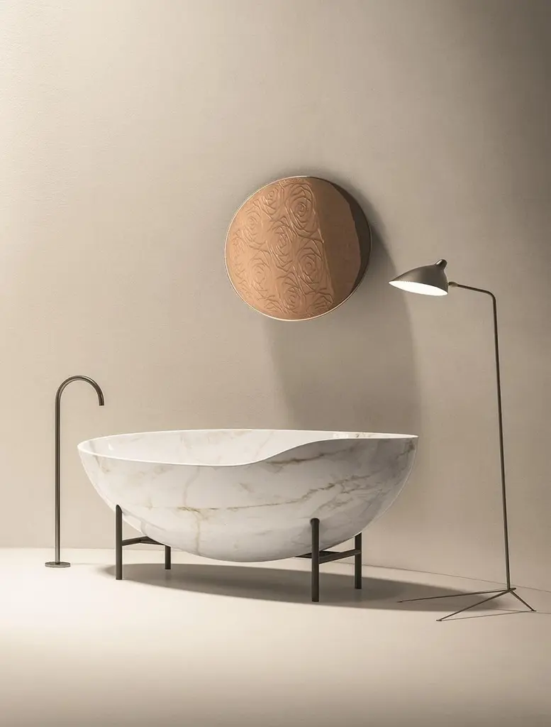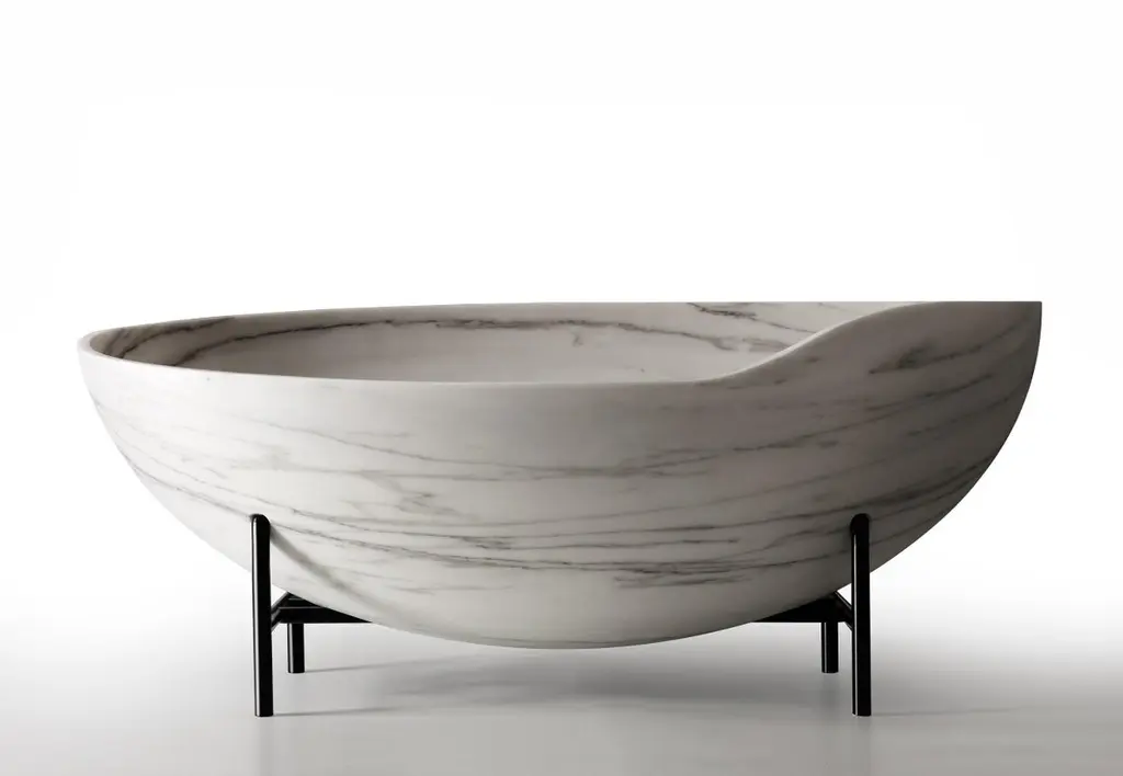 Kora Bathtub by KreooDesigned by Enzo BertiDimensions: D 84 x W 170 x H 74.Materials: Calacatta Carrara marble and black metal. Weight: 305 kg.Kora is available in one size variant and in seven different types of marble. Three metal options are available: dark metal, gold bronze, and dark bronze. Please contact us.Kora marks a harmonious encounter between fluid profiles and geometries, between heavy and light, between marble and metal: the freestanding bathtub designed by Enzo Berti is carved from a single block, with an upper profile at variable heights that facilitates the entrance and gives a very stylish result.The purity of the shape is enhanced by this detail while a metal support, with a gold or dark bronze finish, becomes the base and supports the monolith with an extraordinary effect.Kreoo: the new marble experienceKreoo links its name to the best Italian tradition in marble manufacturing and brings to new light the primordial charm of a material that has witnessed the evolution of civilizations and cultures.From the bathroom and living room to coverings, home accessories, and lamps, the company works with natural stone in various forms and aesthetic compositions, enriching it with other materials such as metals, wood, and glass. The result is a fascinating and chromatic language, suitable both indoors and outdoors. Expressed in contemporary but still customizable designs, Kreoo highlights workmanship know-how and excellence.The brand, born in 2010 by the experience of Decormarmi and its worldwide distribution strength, has led to major international projects, especially in hospitality and luxury residential.