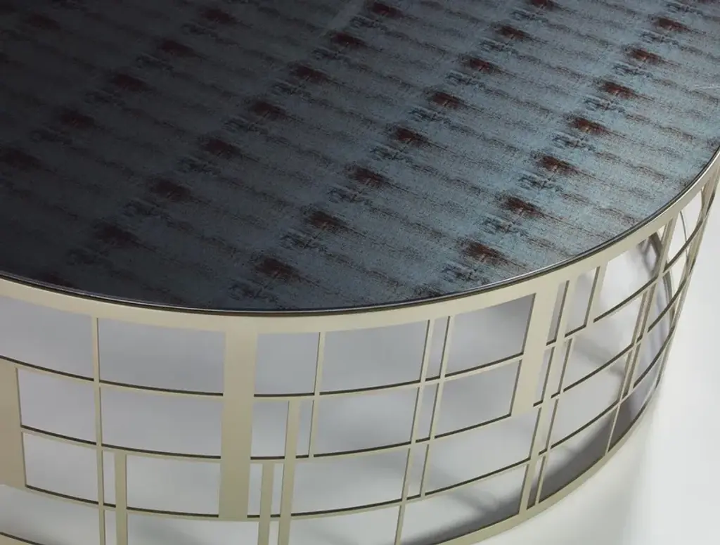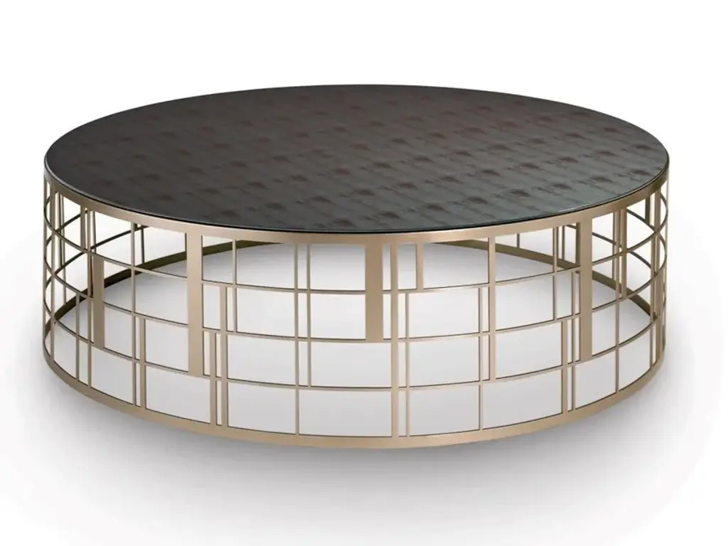 The Koro table has an Art Déco soul, a cylindrical form in metal and a top in Vetrite glass that recalls Tiffany glass. Attractive and refined.Structure in lacquered stainless steel. Top in Vetrite glass.