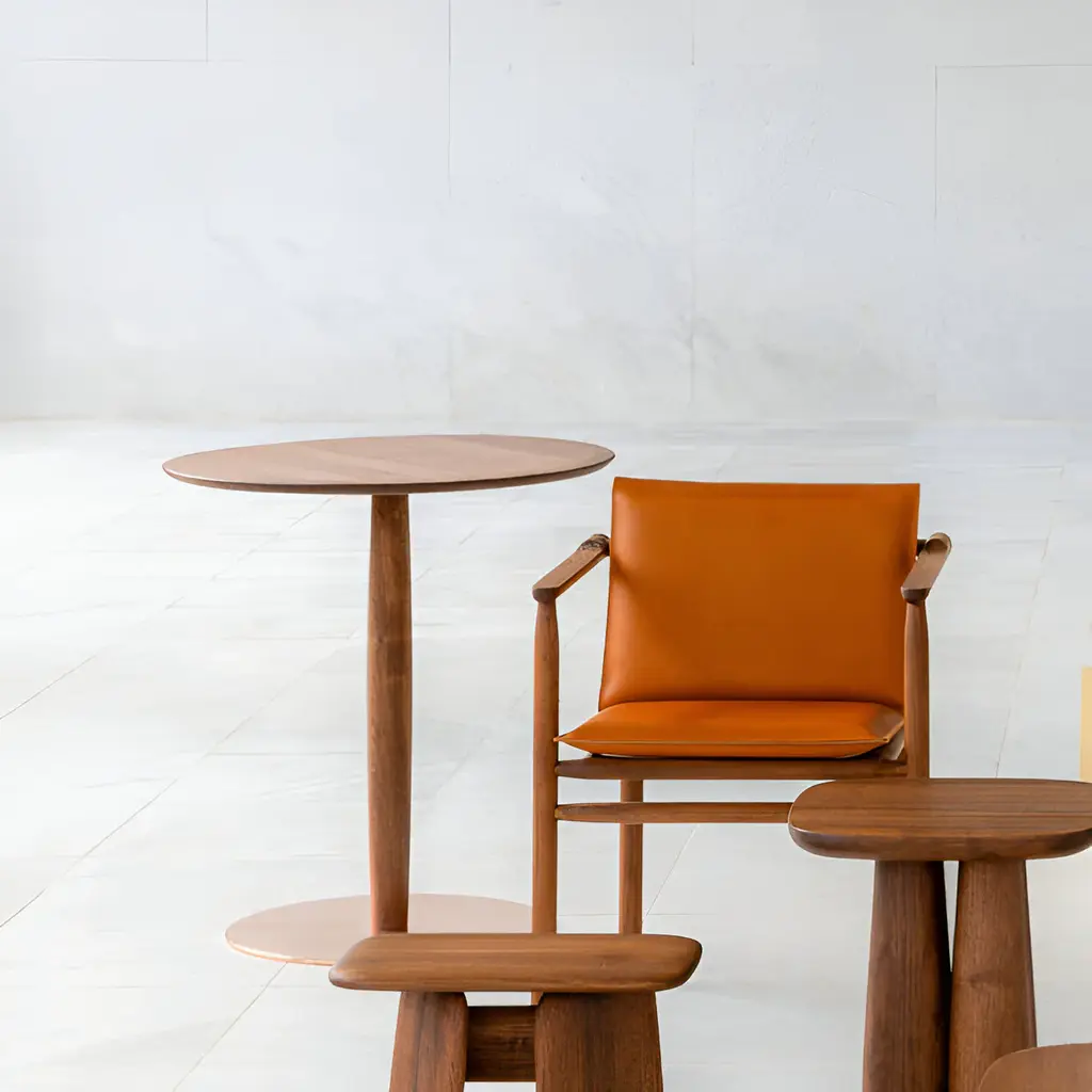The Korzo Bistrot Side Table, designed by Patrick Norguet, features a sculpted wooden base complemented by a tabletop that is lightly chamfered underneath and subtly carved around the edges, offering a tactile yet durable surface. Available in a variety of stains on oak, walnut, or maple. It adds warmth to lounge settings while being robust enough for commercial use. The central support leg and metal accents—offered in black powder-coated steel or copper—contribute to both stability and elegance. Available with a square or round tabletop.