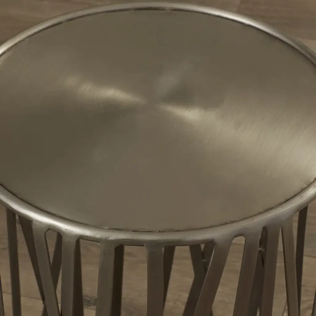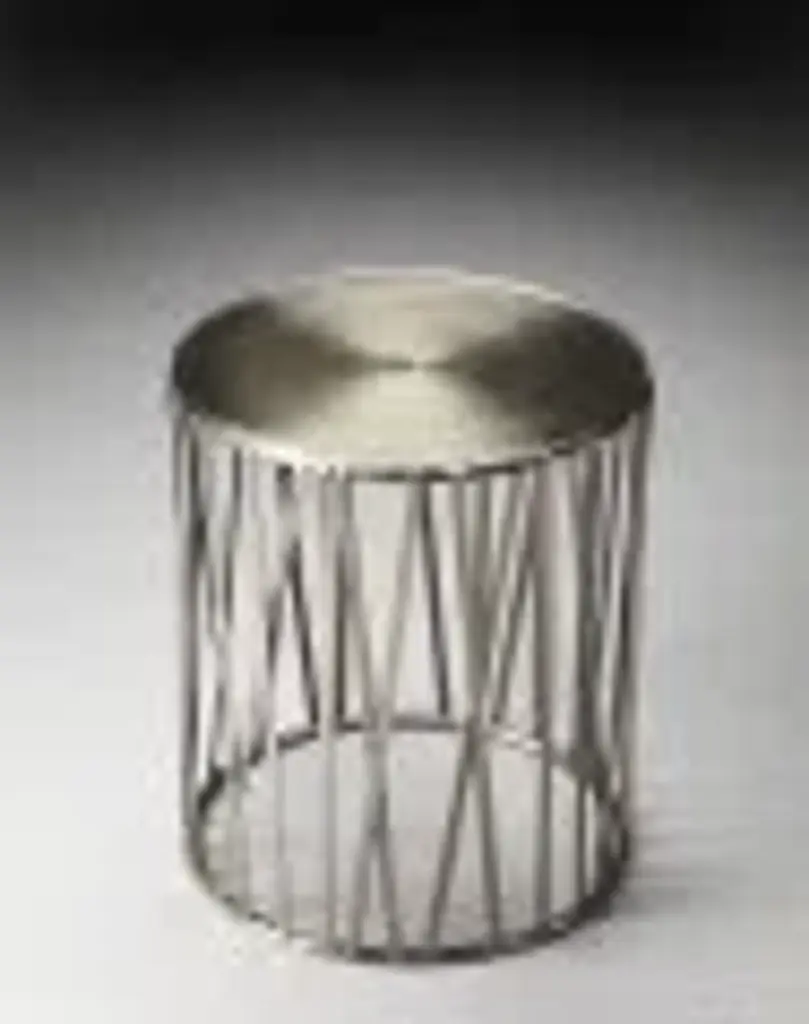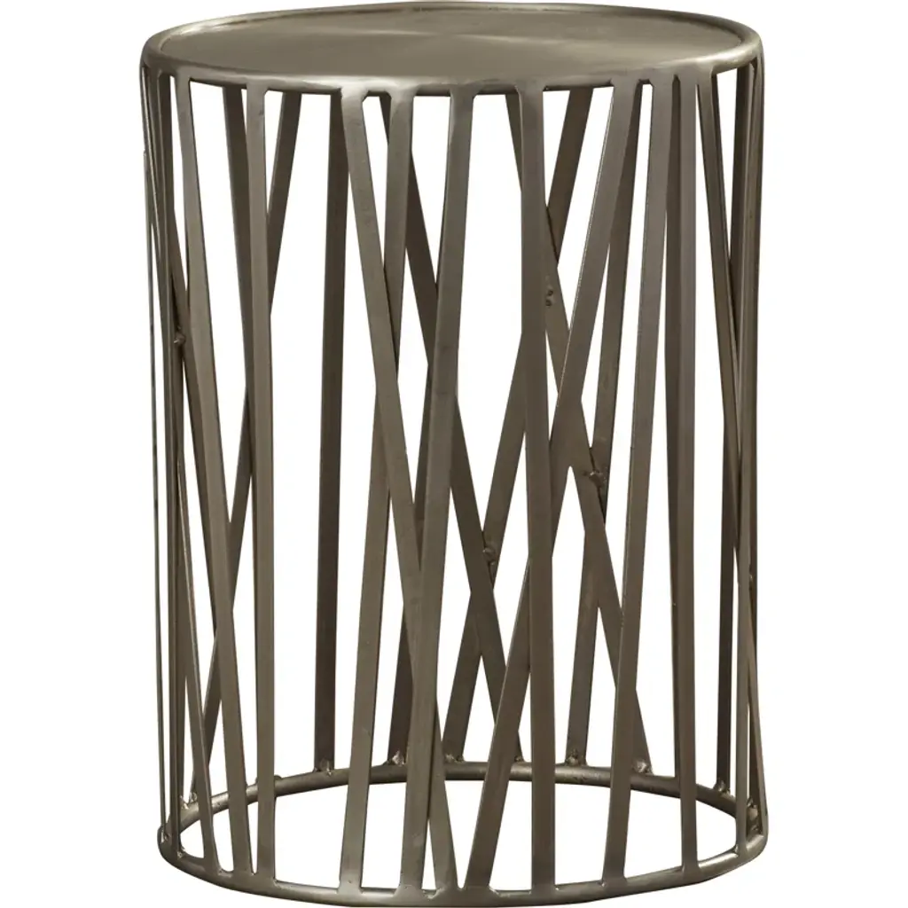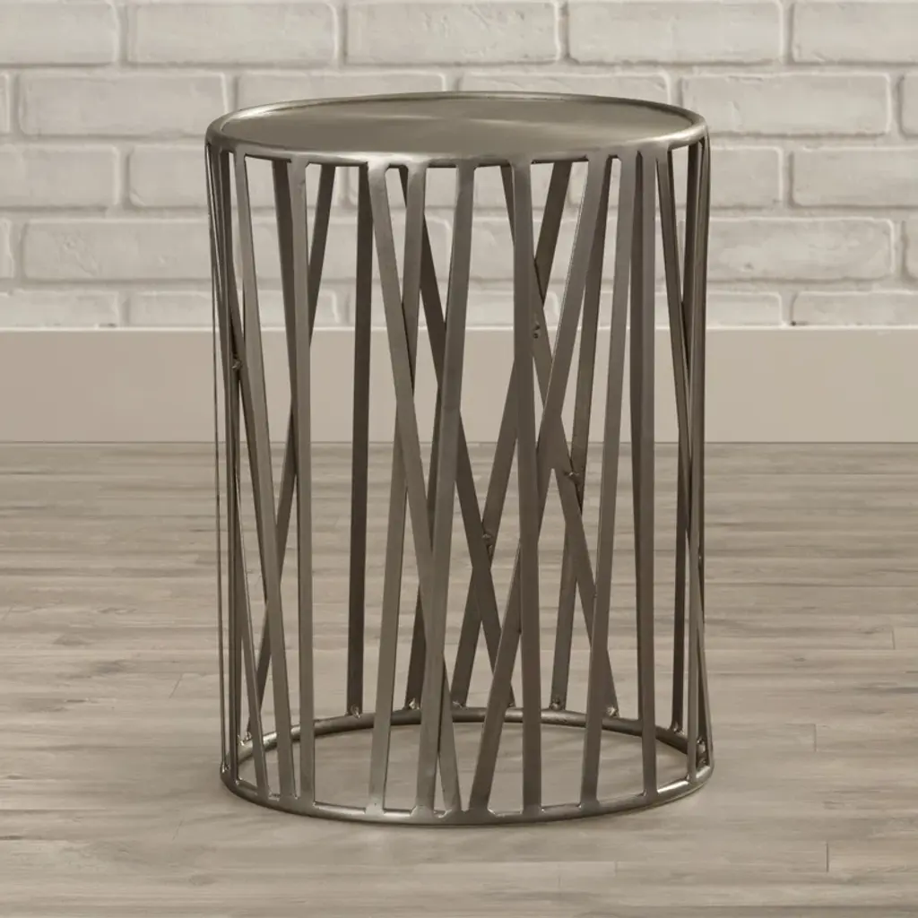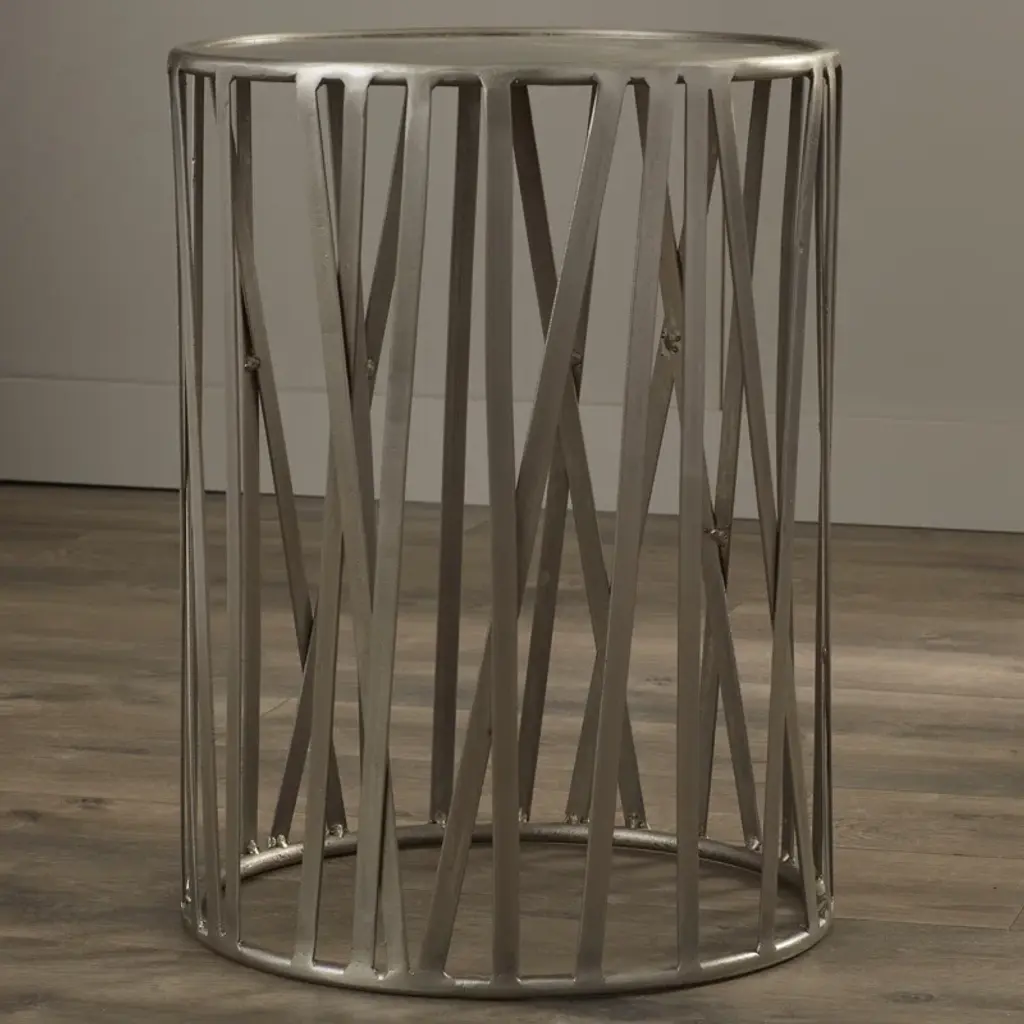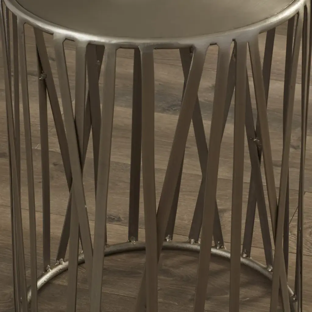 A glam twist on a modern industrial design, this eye-catching end table also showcases an open drum silhouette. It's made from steel with a distressed silver finish. Plus, multiple vertical bars, some slanted and some straight create a visually appealing look along the sides between the tabletop and the base. With a diameter of 13.5", the surface is a great platform for an accent lamp a book, and a beverage. Set it next to your favorite cushy armchair or beside your living room sofa. No assembly is required.