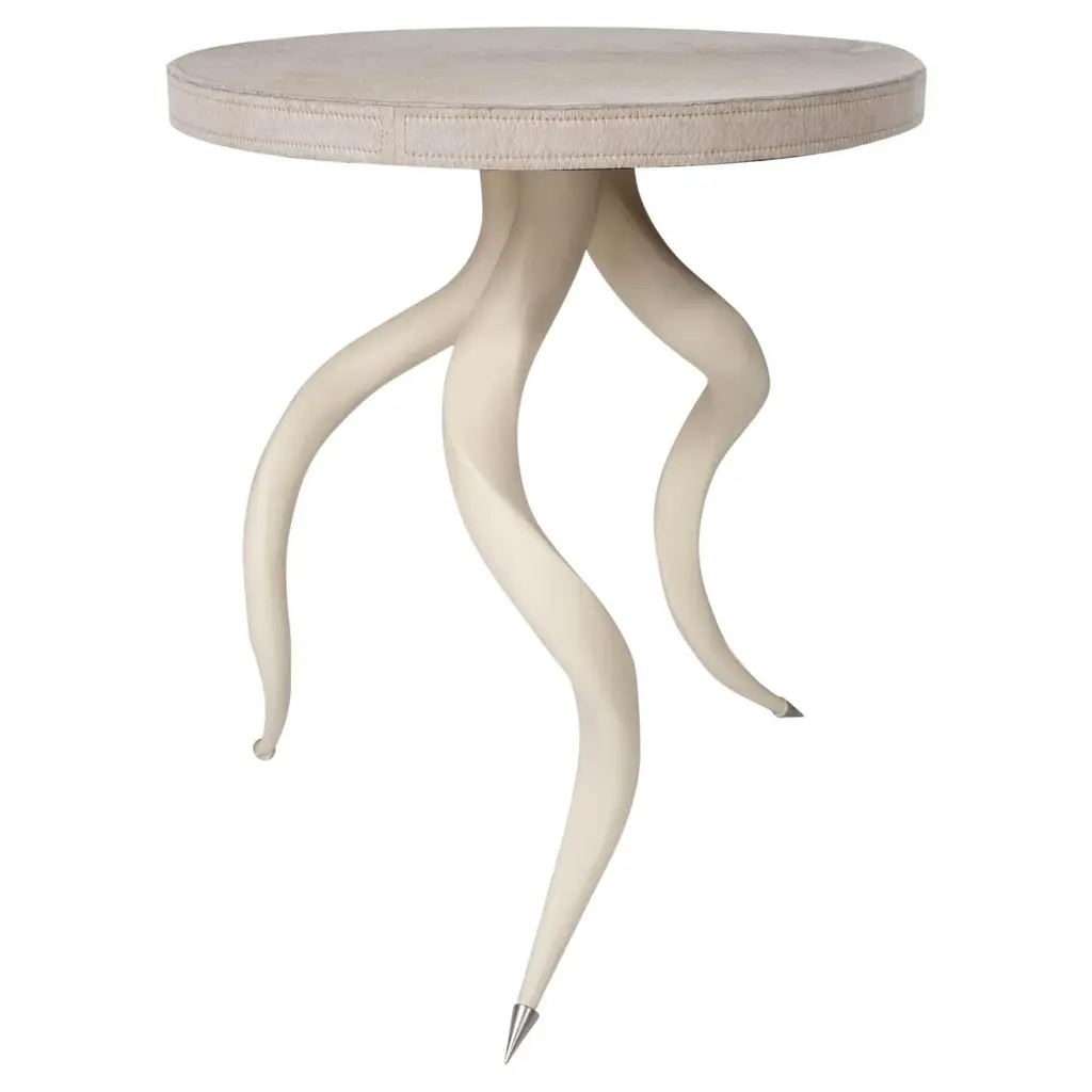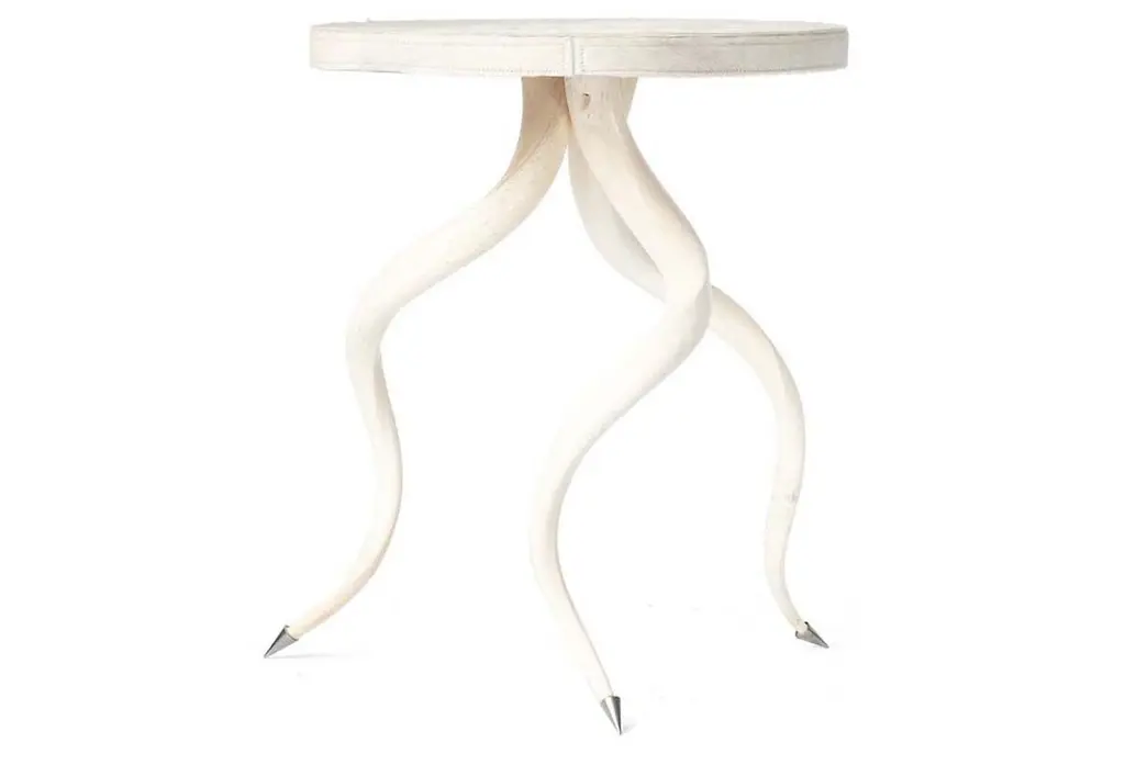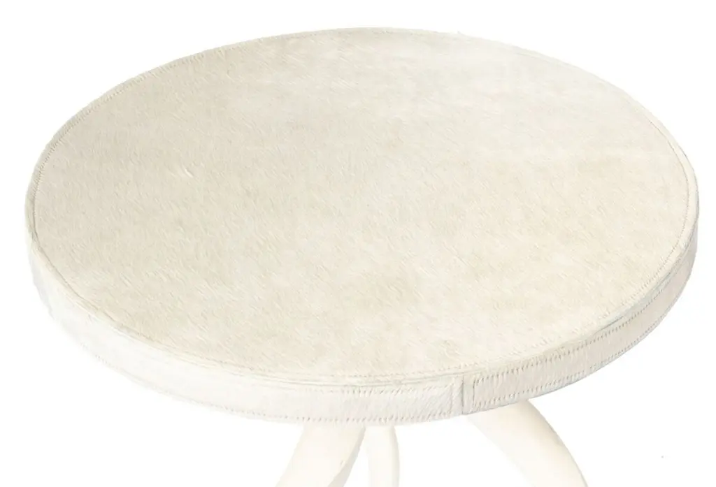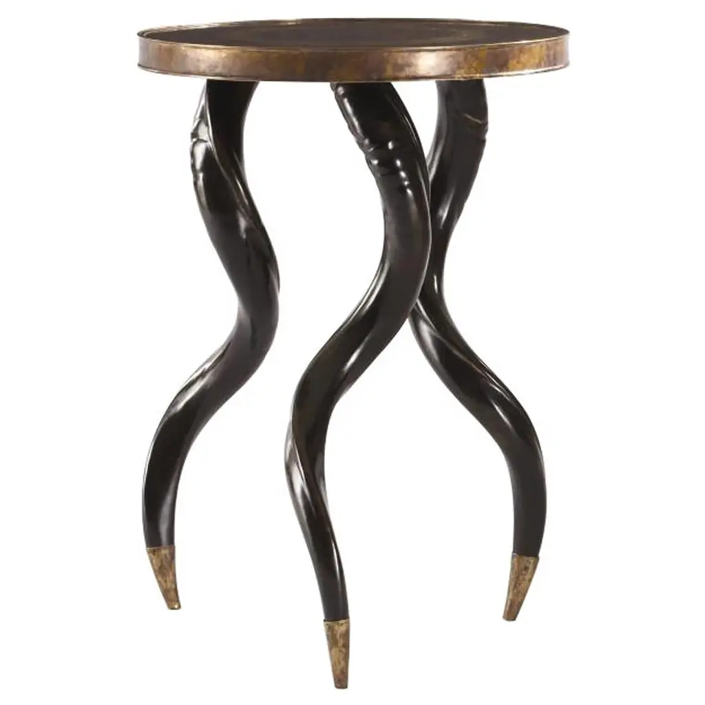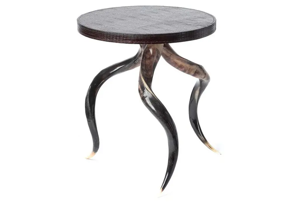 A naturally luxurious addition to any room, this side table is set on a trio of sustainably sourced, polished kudu horns and topped with a round surface wrapped in top-stitched hair-on-hide leather.