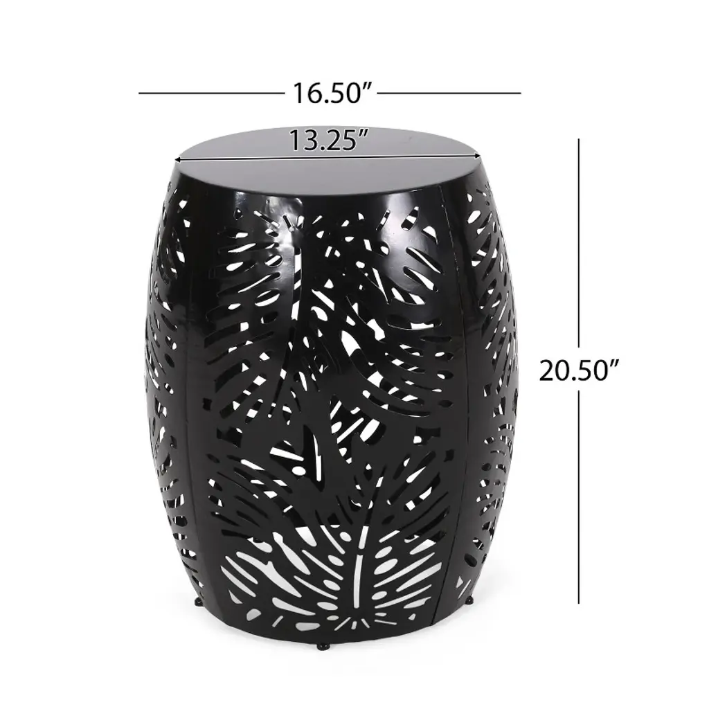 Bring a touch of modern charm to your space with this stylish side table, featuring clean lines and a unique barrel-shaped silhouette. The iron-cut frame showcases an elegant tropical palm leaf pattern, adding a breezy, nature-inspired detail to its minimalistic form.Crafted from powder-coated iron, this table is built to withstand daily use while maintaining its sleek look—making it a durable and reliable addition to your home or outdoor setup. Whether placed beside a sofa, lounge chair, or on the patio, it offers both functionality and artistic appeal. Best of all, it arrives fully assembled and ready to enhance your space right out of the box.Dimensions: 16.50” W x 16.50” D x 20.50” H.Assembly: Not required.
