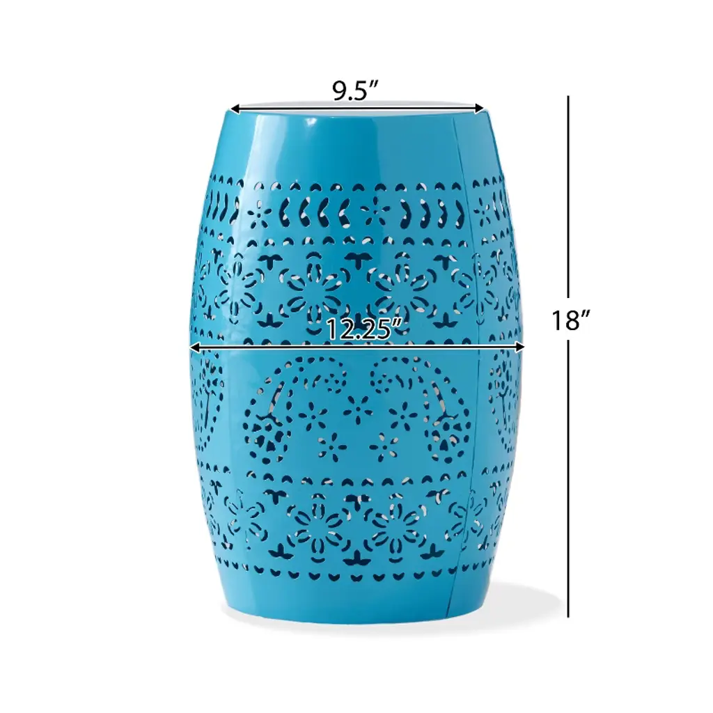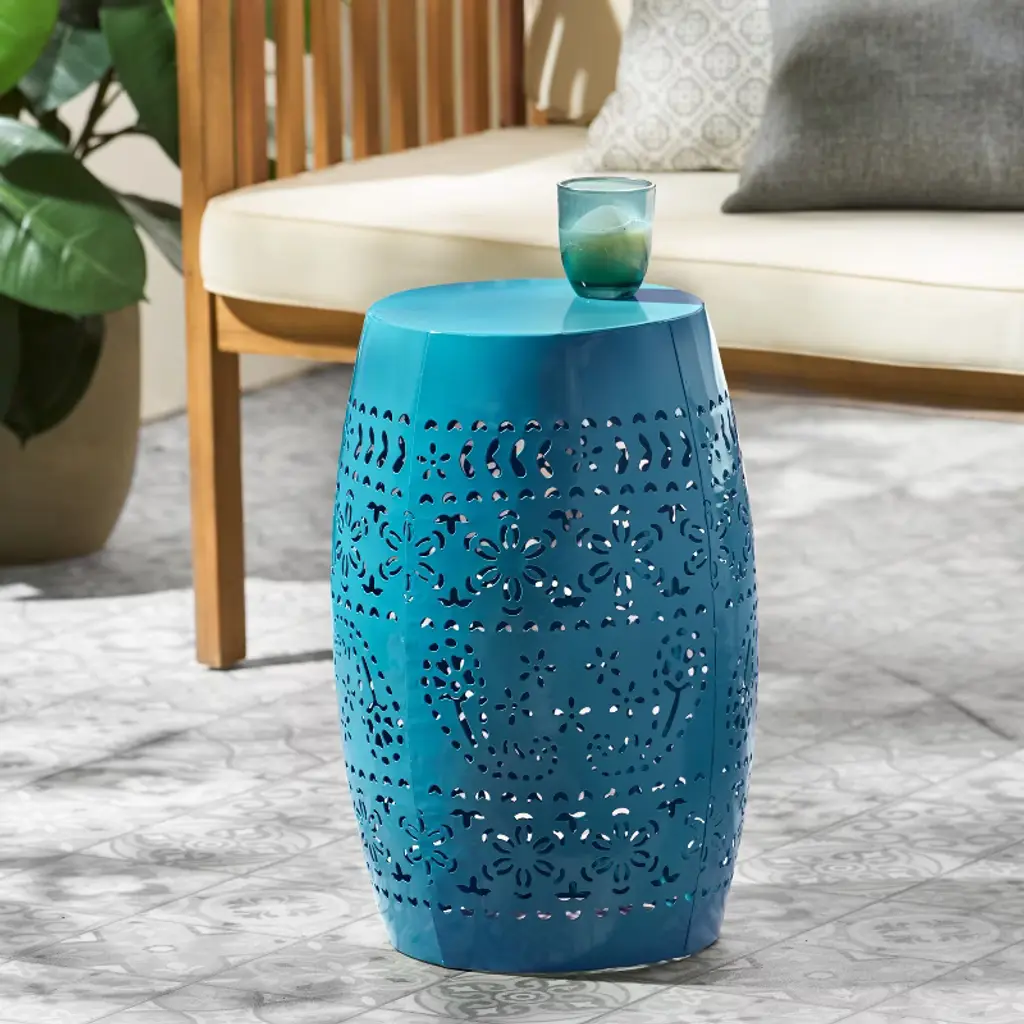 Kwpzqeb Barrel Side Table, Lace Cut Design Outdoor Side Table, Weather Resistant Metal End Table For Patio Balcony Garden Living Room - Light Blue