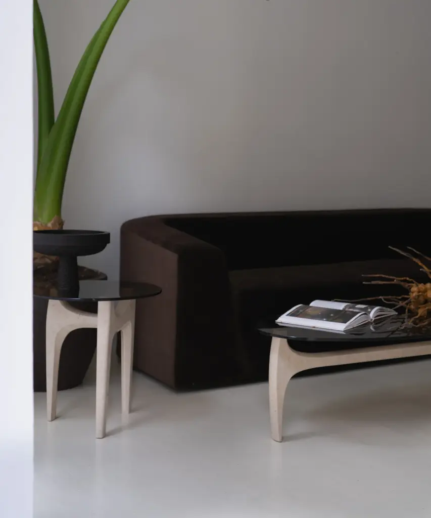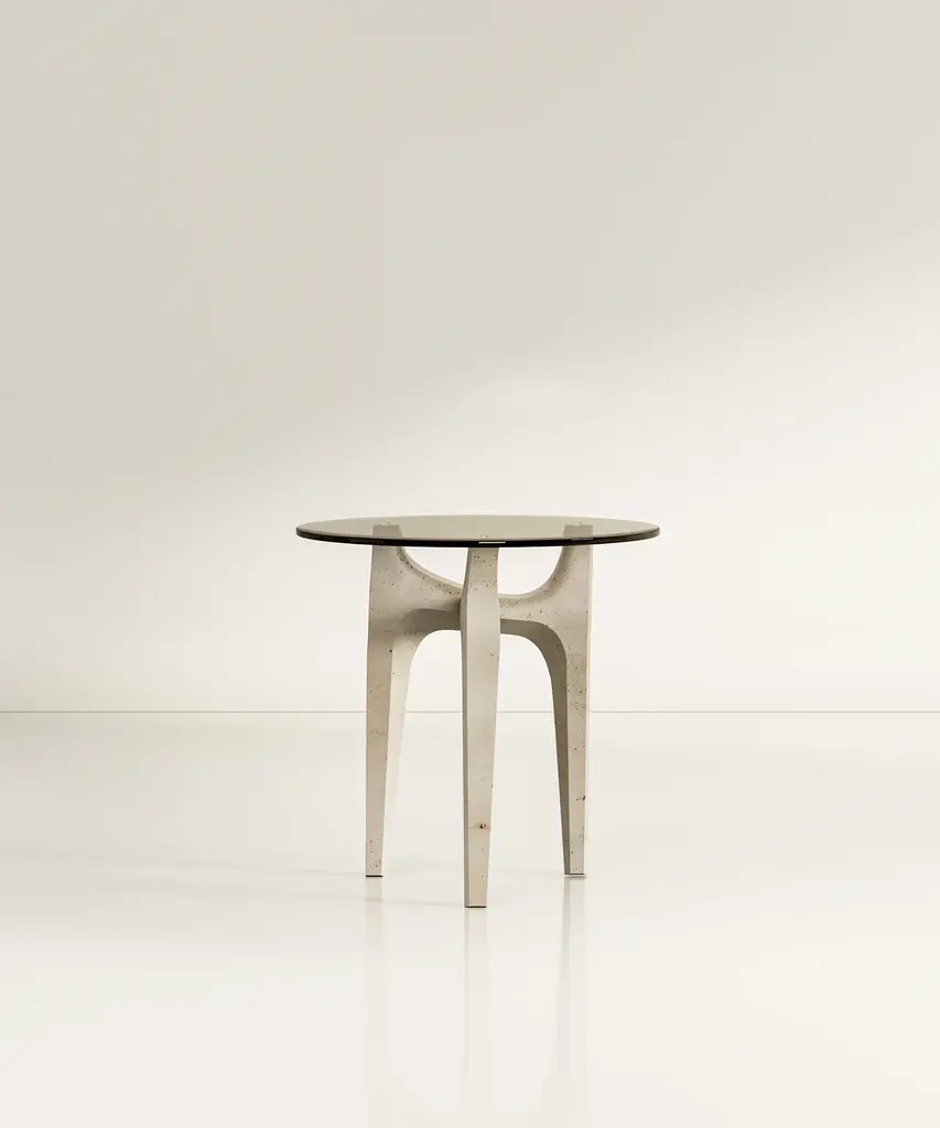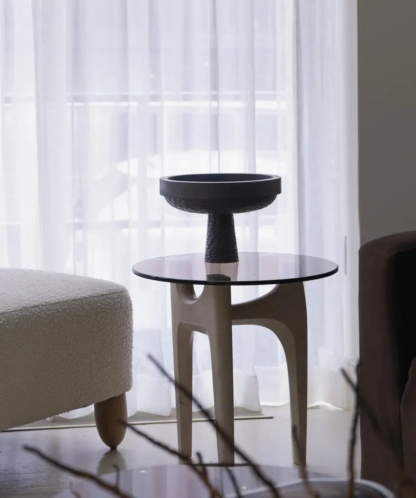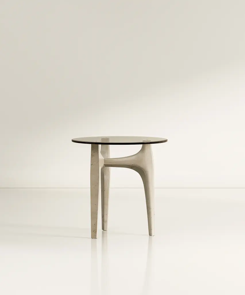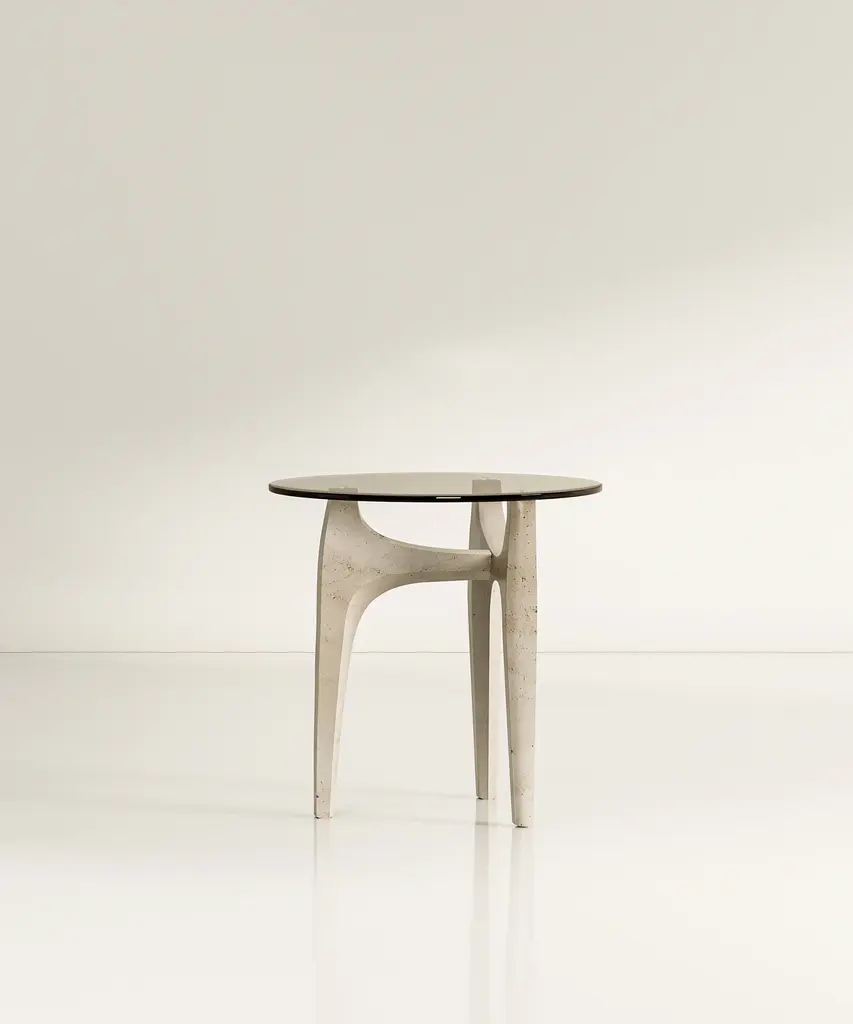 The Kyaman Side Table points to the gold jewelry that decorates the hair of the Kyaman women of the Ivory Coast. The pieces are made from a carved limestone base and a bronzed glass top. Made by craftsmen in Portugal.