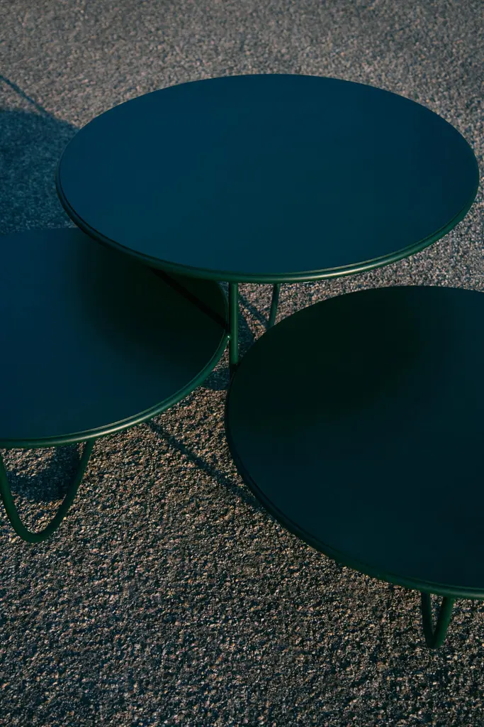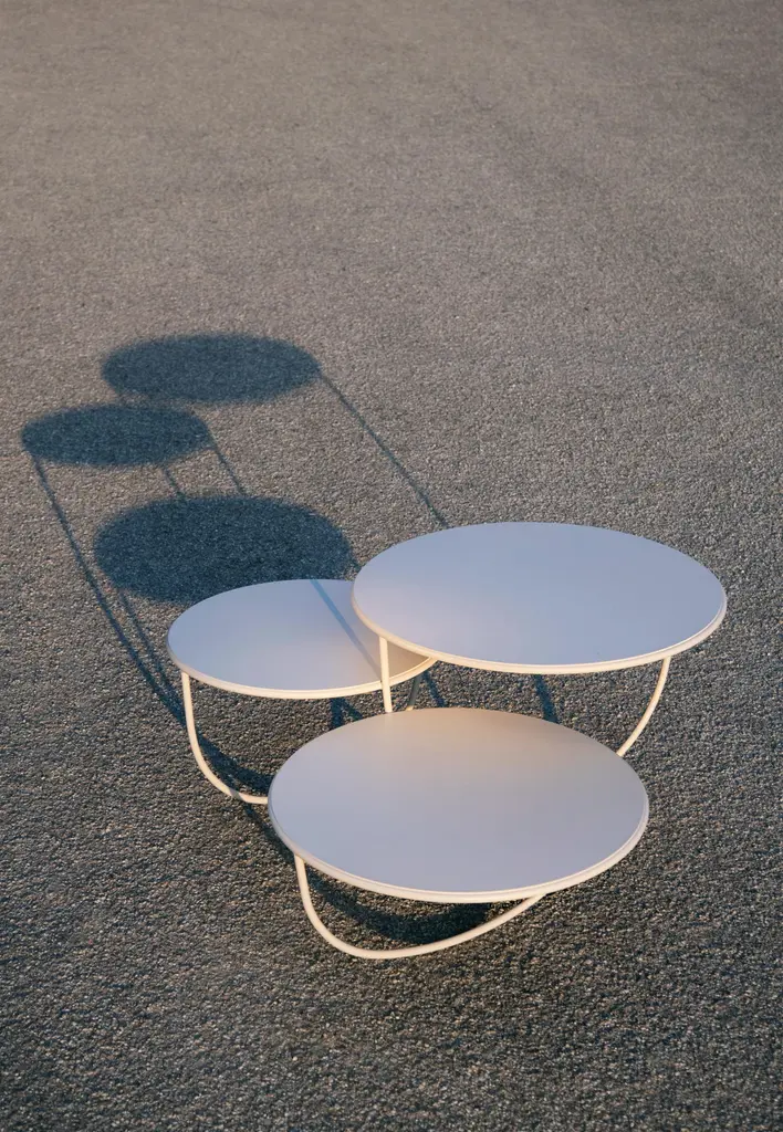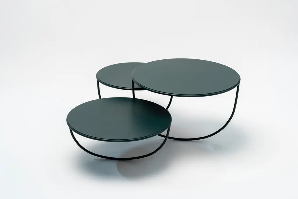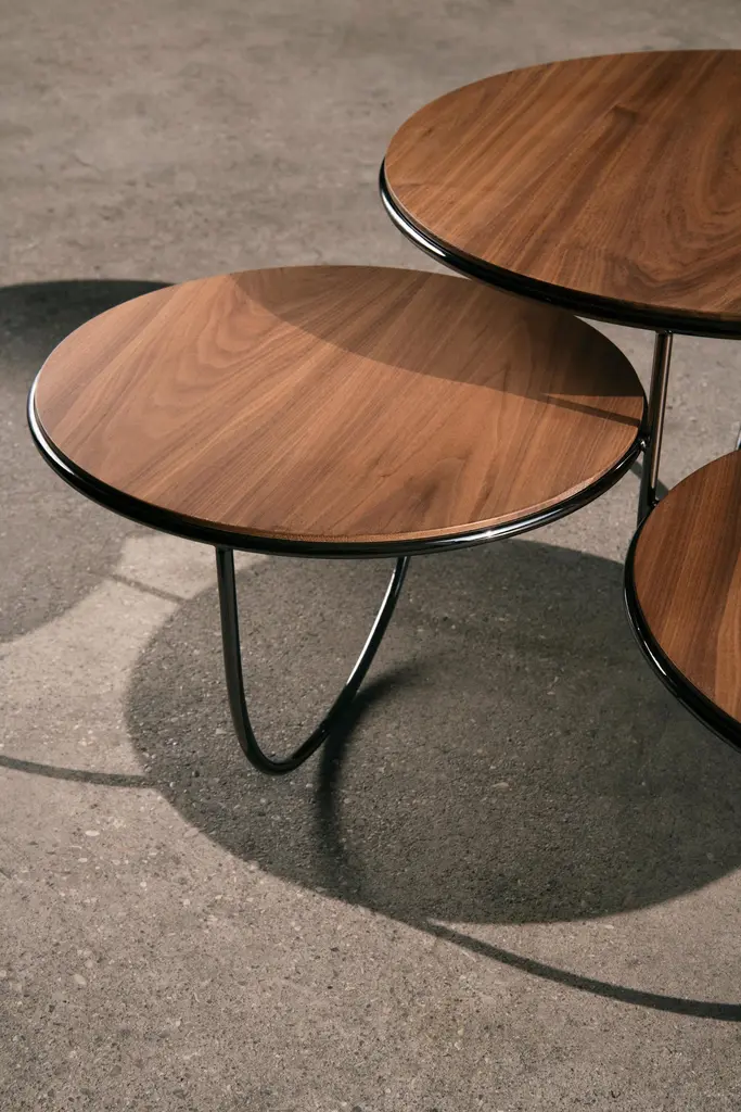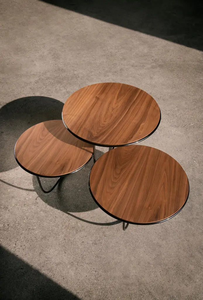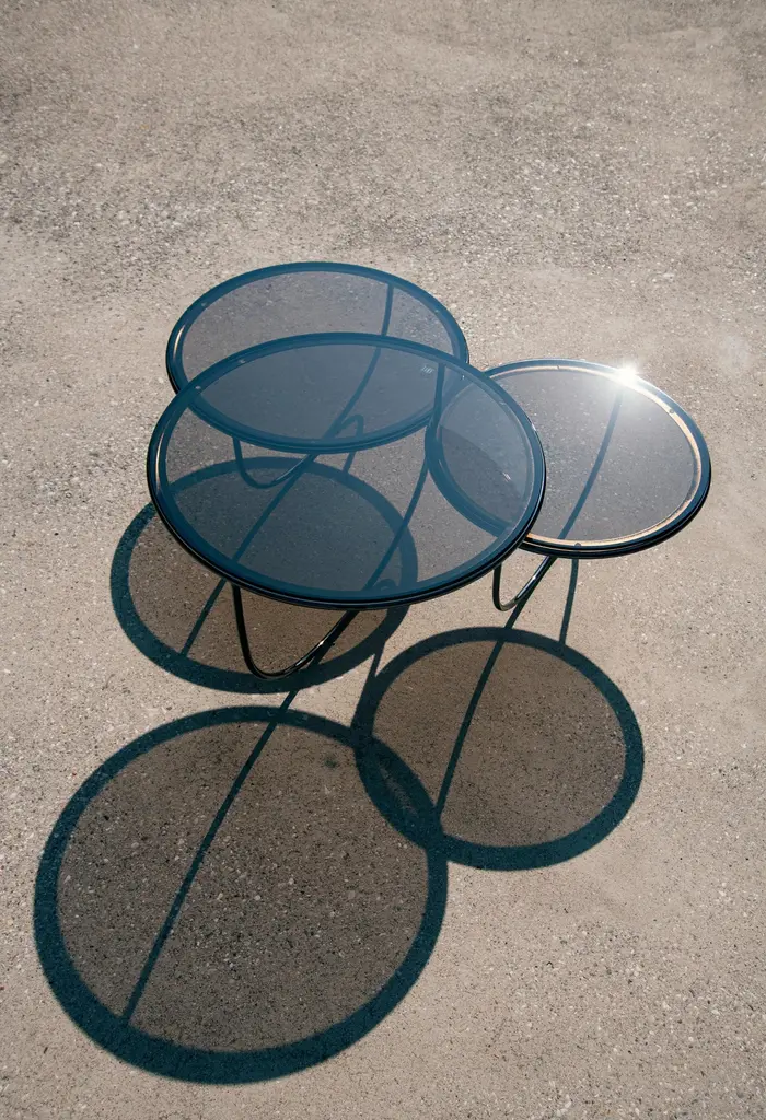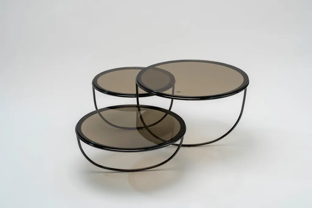 At first sight, Trio is a side table that consists of three transparent bowls overlapping one another.The opening of each bowl is covered with either a glass, metal or wood top. The shape of the bowl is suggested by a single curved line — seemingly a spectacular feat of balance, yet the result is surprisingly stable, with each shape secured to the others in two different points. This single-leg structure supports several table tops, contrasting with more traditional table designs.Dimensions:84,7cm x 76,3cm x H 33,9cmMaterials: base metal chrome or metal, top wood noce canaletto, glass or metalColours Glass: smoke clear, grigio kaiser glass. Colour base: black chrome.Colours Top: light, coral, dark green, black.