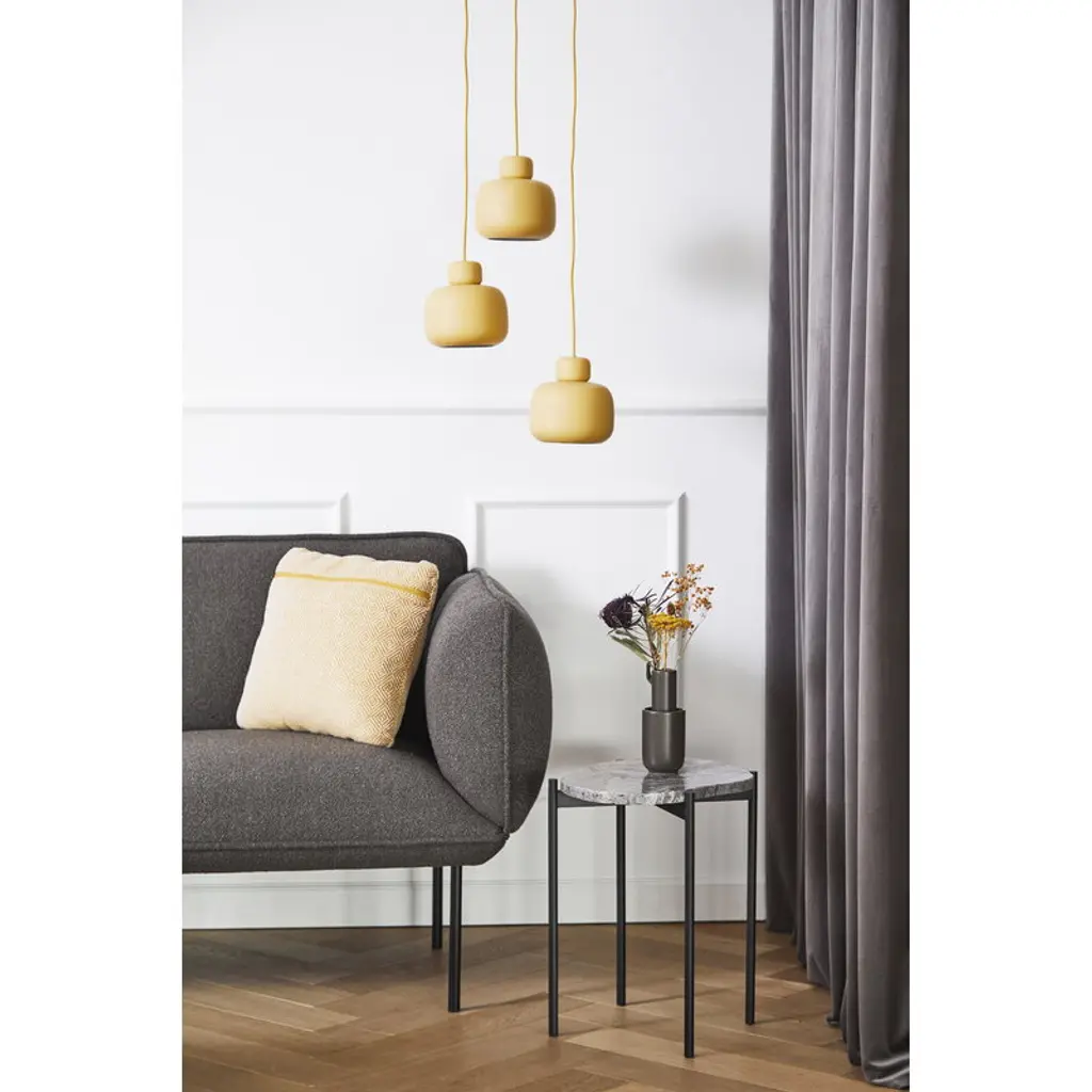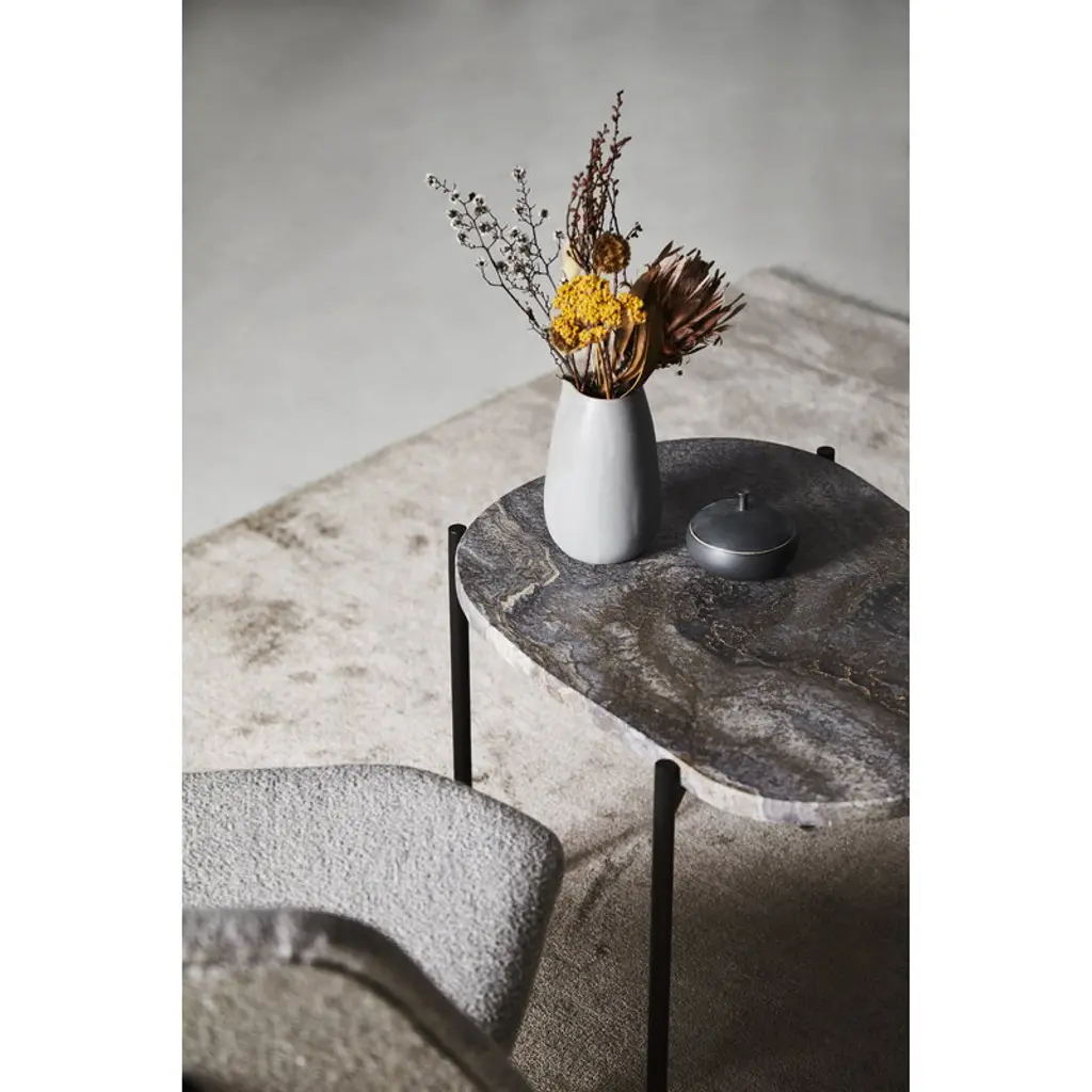 Woud’s La Terra occasional table is dominated by a minimalist look and an elegant, nature-inspired design language. The table consists of a simple metal frame and a table top, made of travertine, with an organic, irregular shape reminiscent of pebbles on the beach. When creating the table collection, designer Agnes Morguet imagined a barren, rocky beach landscape – she wanted to translate the tranquil atmosphere of a barefoot walk to the design. Just like every pebble on the beach, every La Terra table is unique, as the travertine top's patterns and shades vary from gray and beige all the way to black and brown. Place a single table next to a sofa or armchair as an elegant side table, or use the different-sized tables from the La Terra collection to create a beautiful ensemble of tables as the centerpiece of your living room!