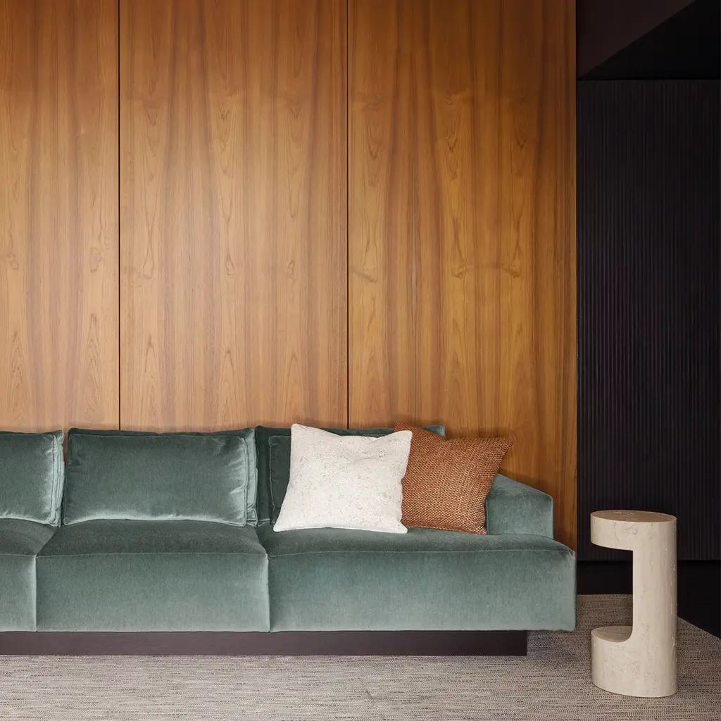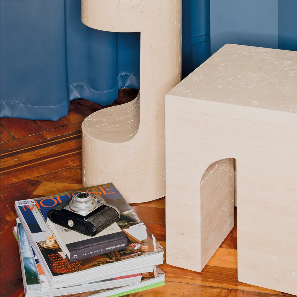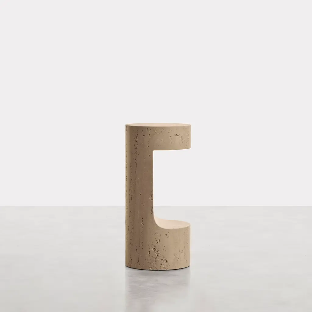 The shapes, as in the name, are a clear reference to a musical wind instrument. An impeccable workmanship of travertine highlights in the hollowed-out part of the throat, the unique characteristics of this stone. An unexpected design that seems to expel the specific weight of the material in which it is made. The shape implies its inspiration, in fact, in music it represents the typical shape of some wind instruments. Monolithic milled structure in solid Roman Travertine.