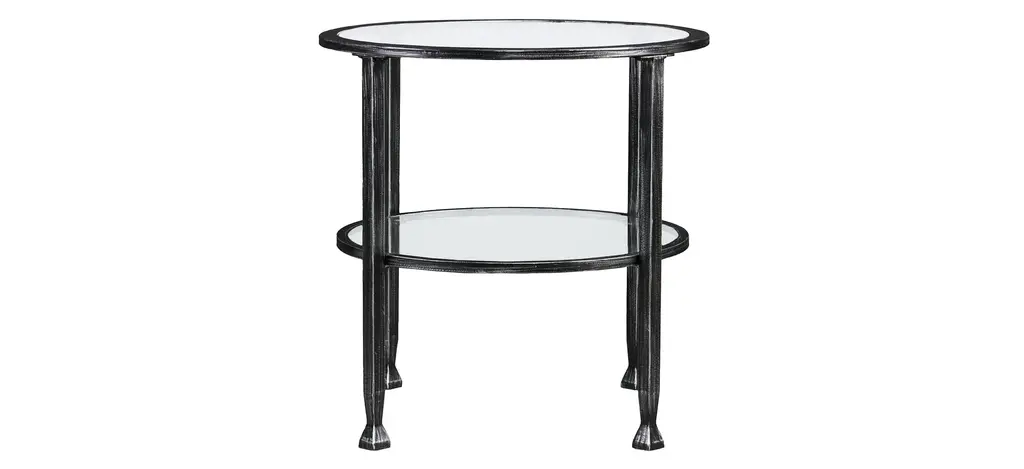 The Laforge features a timeless two-tiered form crafted from natural iron with brazed brass details finished in a rich antiqued gold. Matching clear glass shelves provide an added touch of beauty. It lends simple elegance, easily styling in living rooms or bedrooms for an elevated design.