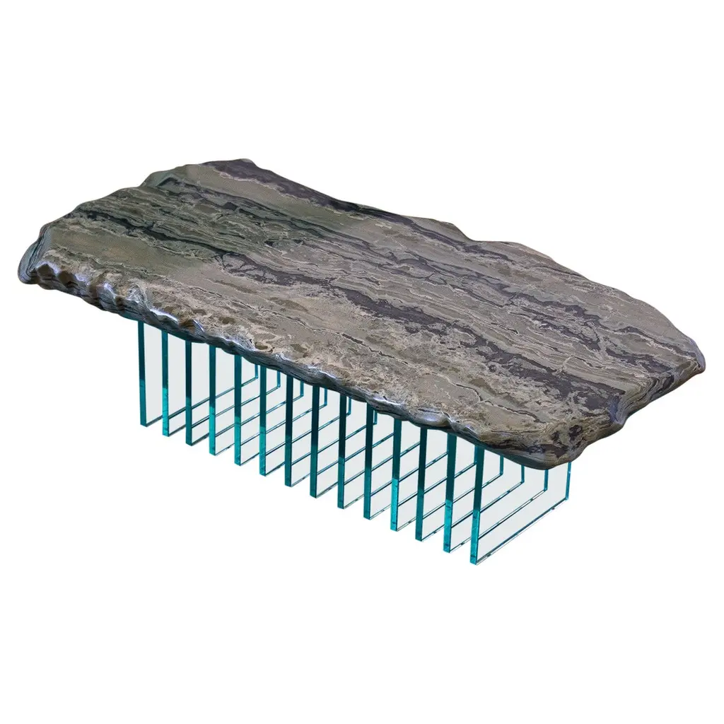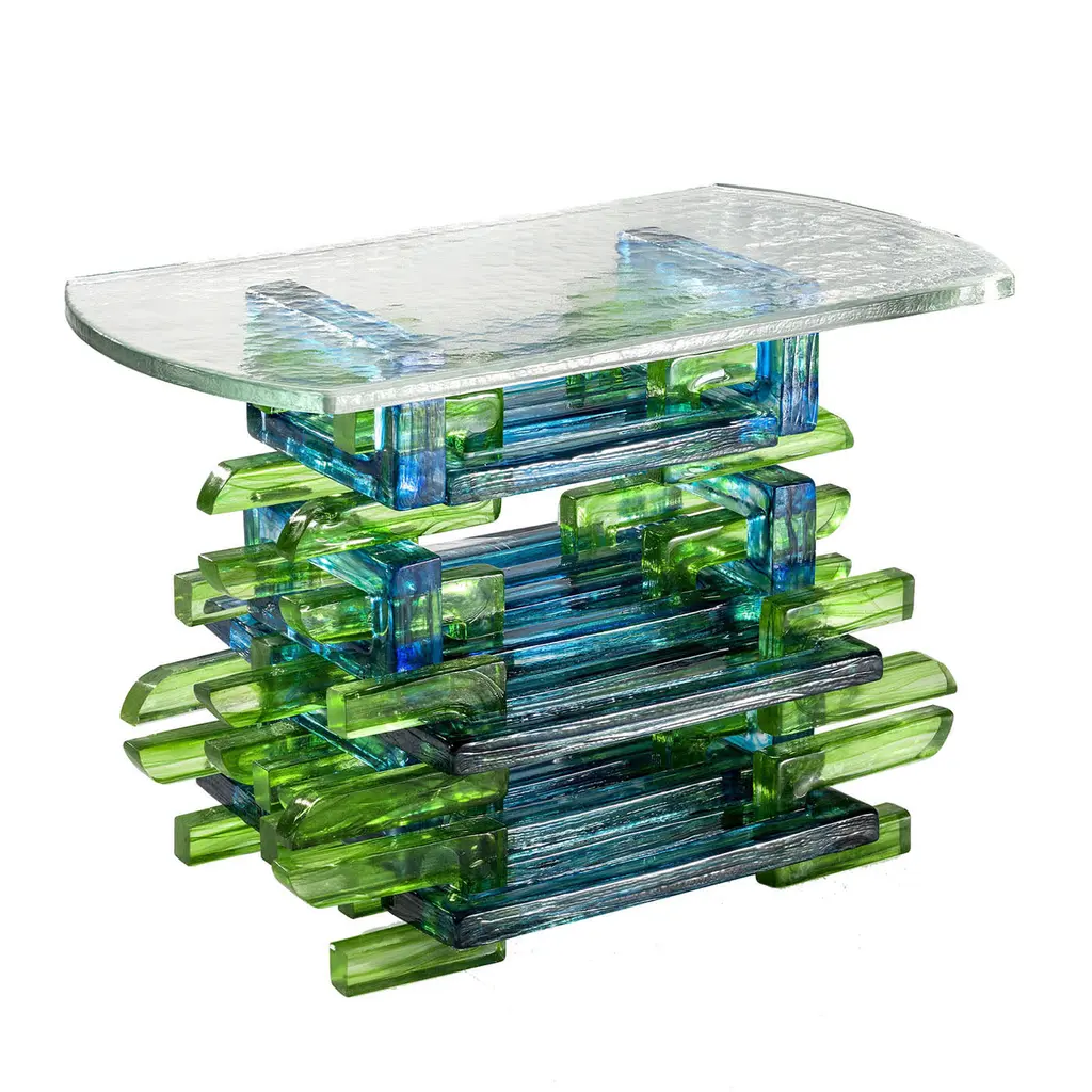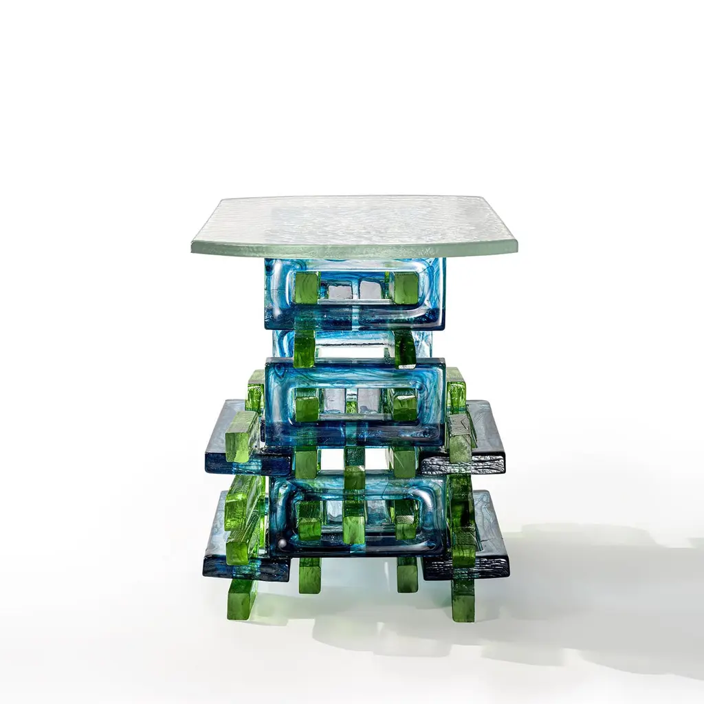 The Laguna Chain Side Table is crafted from interlocking ringed bricks, each split into two and threaded through others to form its structure. The curved, polished ends of the bricks echo the detailing seen in Japanese wooden temples. Its blue and green hues evoke the tranquil canals and lagoons of Venice. This piece is a numbered edition, blending intricate craftsmanship with a nod to historical design elements in a contemporary context.