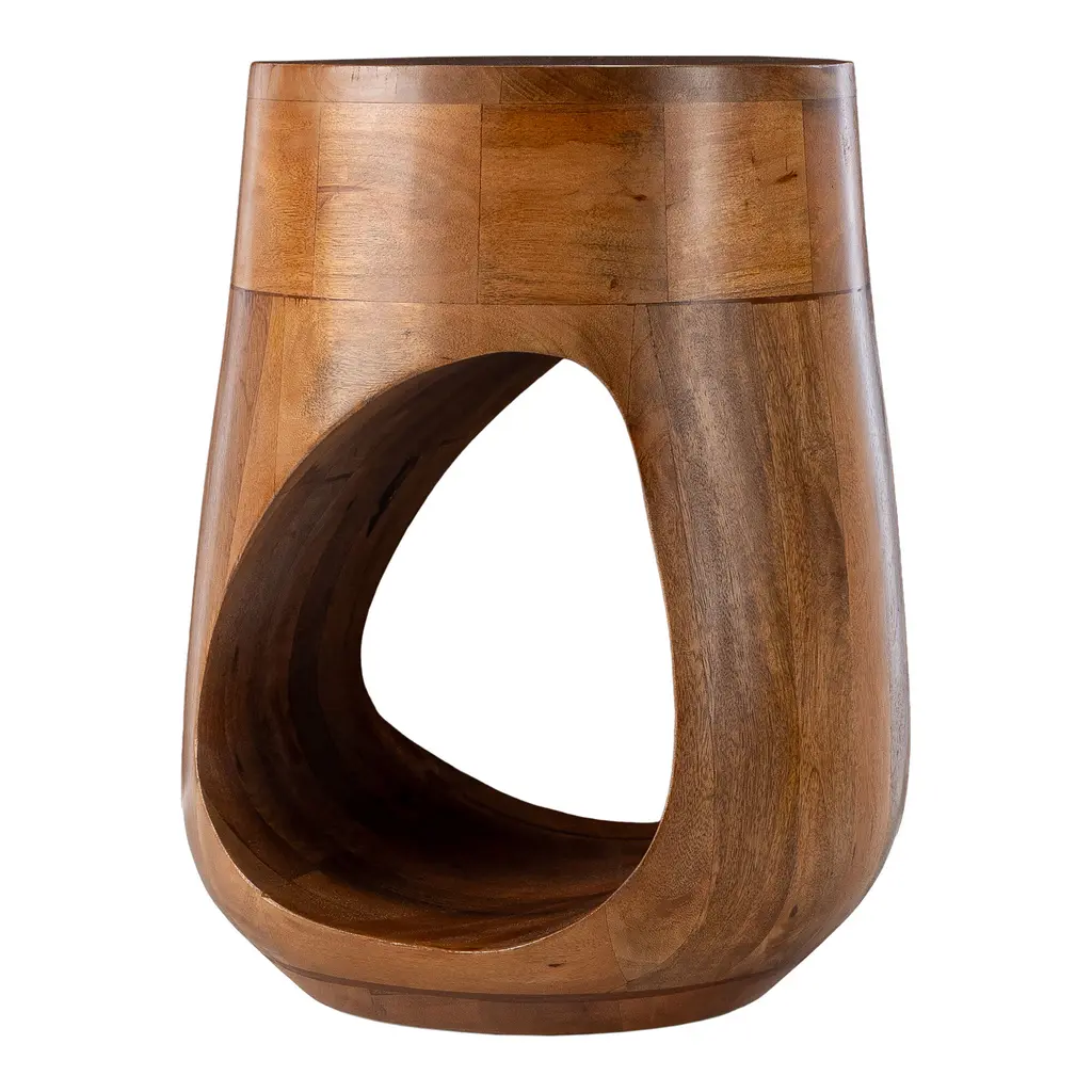 The Lambert side table features a teardrop-shaped cutout in its rounded base that adds an intriguing element of negative space while reducing its weight. Crafted of solid mango wood in a choice of finishes, this compact accent table is a sleek contemporary statement piece that elevates any setting. A practical pedestal for decor, drinks and books, it draws the eye with its sculptural form and saves space in any room, hall or entryway.