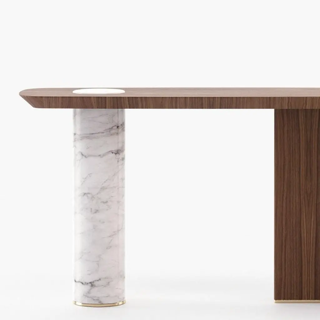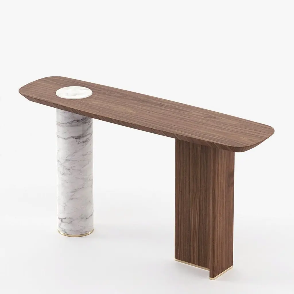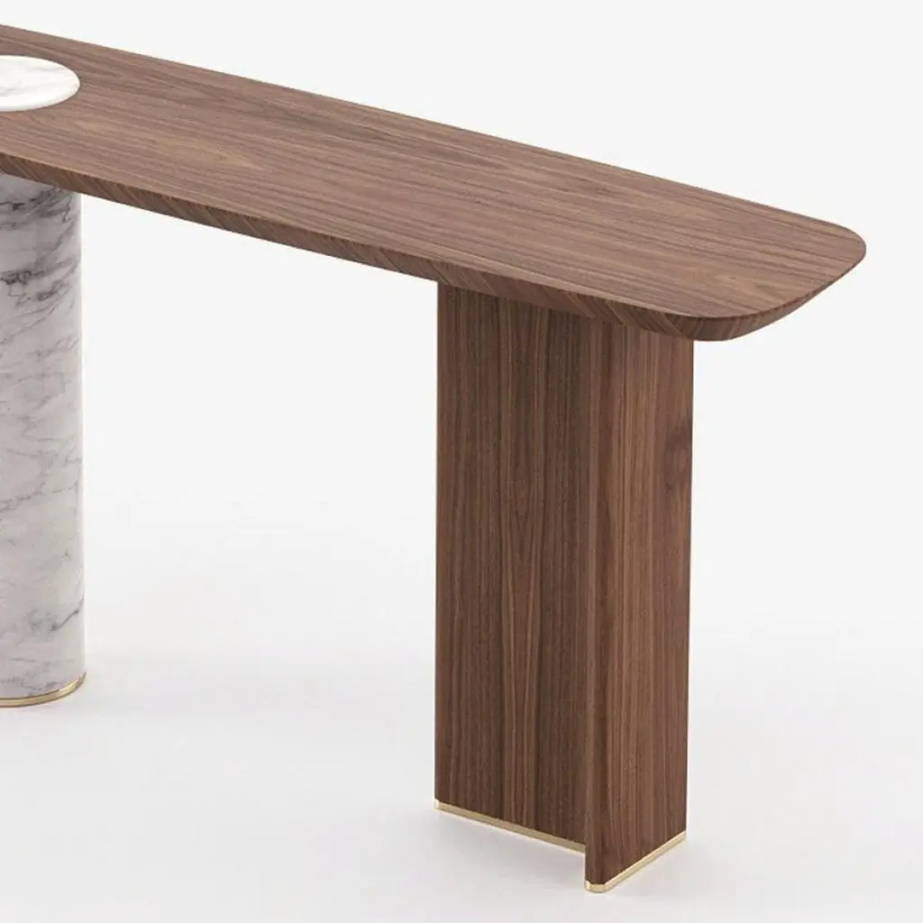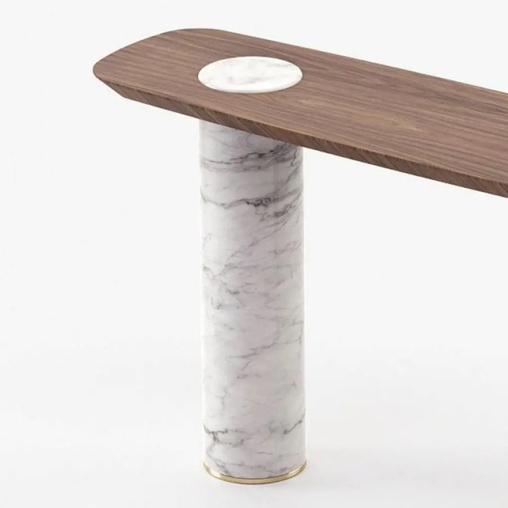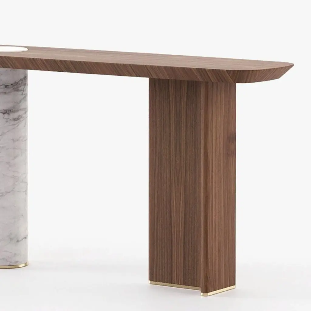 Console Table Lambra Marble with wooden top and feetin walnut veneer in matte natural finish. With white carrara marble cylindric base. Console with polished stainless steel end feet in gold finish. Also available on request in grey oak matte, or natural oak, or ebony matte veneer finishes. Also available on requestwith base in black marble finish.