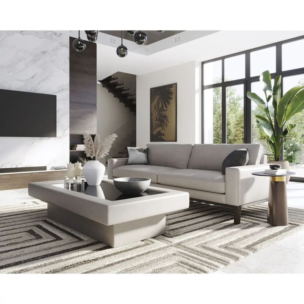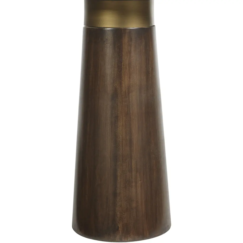 Defined by its fabulous form, this stunning end table features an unconventional shape that will captivate any space. Crafted with a black glass top and a dark brown concrete base with a timber effect. A powder coated brass metal rim completes the look. Crafted from a natural concrete mix, each piece will look different. Variations in colour, texture, imperfections, surface scratches and non-structural hairline cracks are considered inherent and valued qualities of the material.